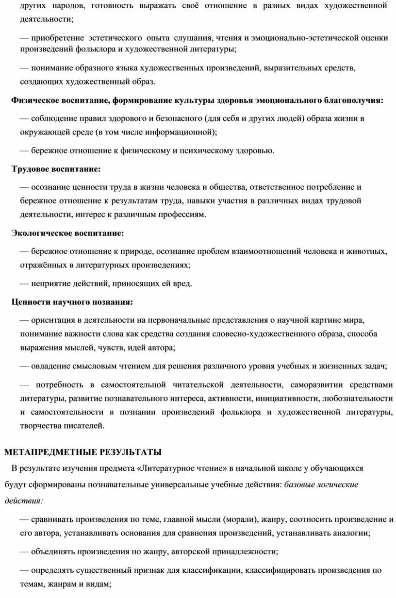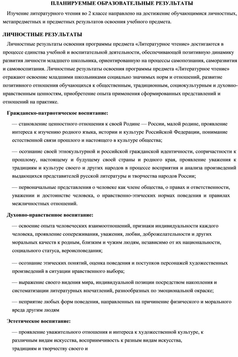 Личностные результаты освоения программы предмета «Литературное чтение» достигаются в процессе единства учебной и воспитательной деятельности, обеспечивающей позитивную динамику развития личности младшего школьника, ориентированную на процессы самопознания, саморазвития и самовоспитания. Личностные результаты освоения программы предмета «Литературное чтение» отражают освоение младшими школьниками социально значимых норм и отношений, развитие позитивного отношения обучающихся к общественным, традиционным, социокультурным и духовно- нравственным ценностям, приобретение опыта применения сформированных представлений и отношений на практике.
