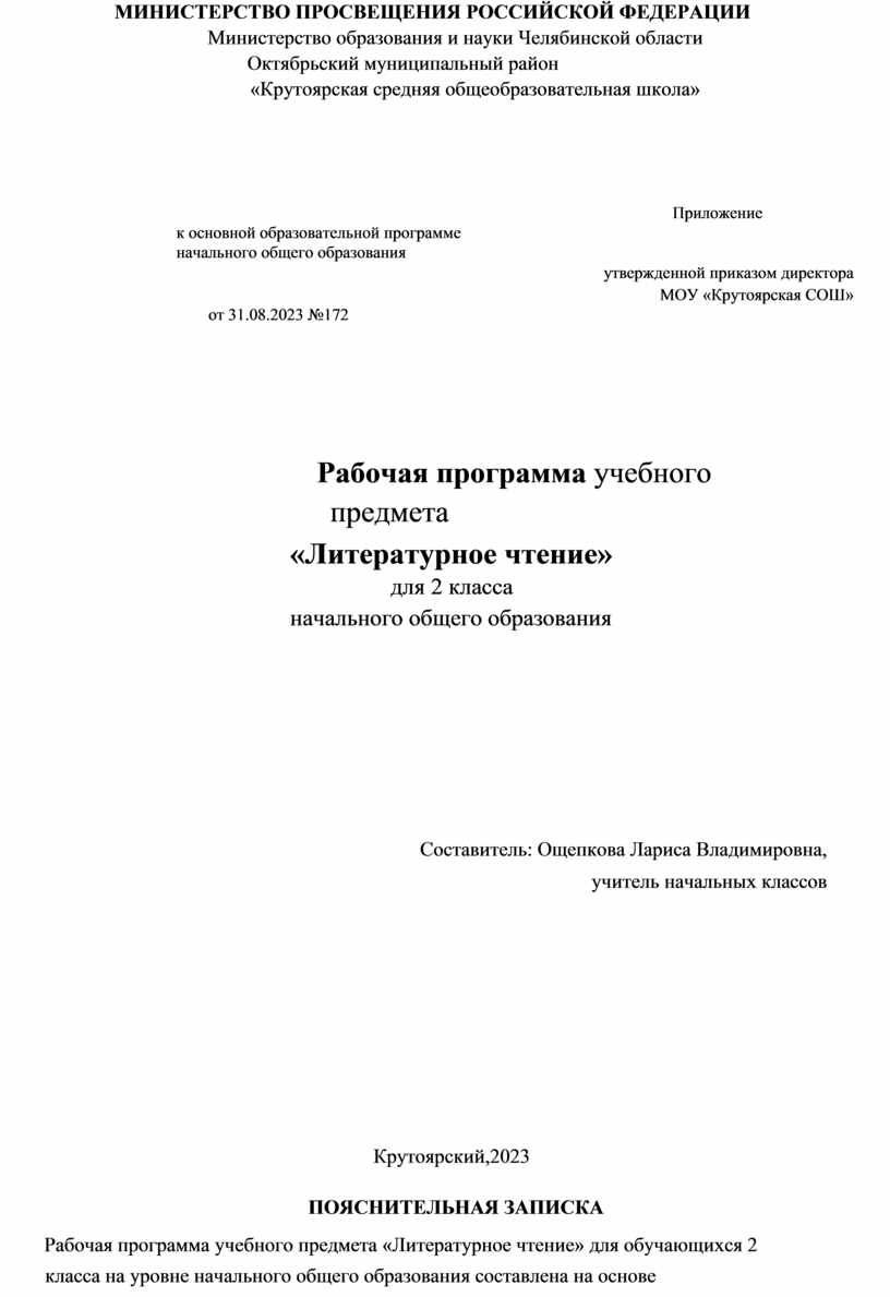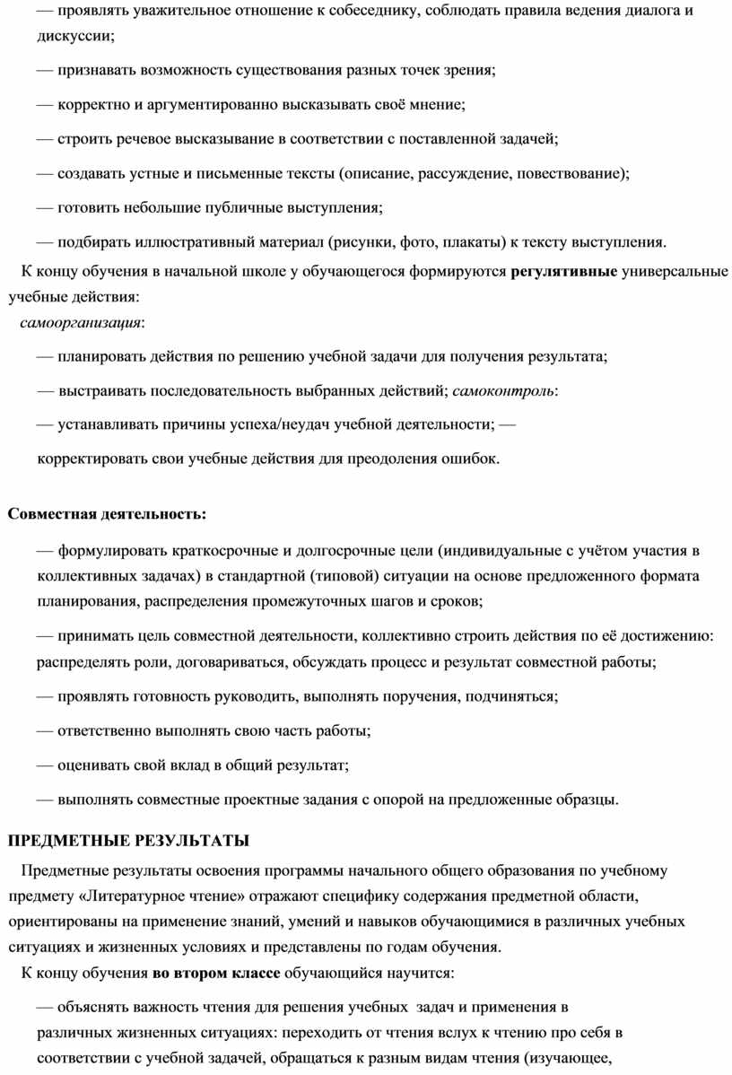 Рабочая программа учебного предмета «Литературное чтение» для обучающихся 2 класса на уровне начального общего образования составлена на основе Требований к результатам освоения программы начального общего образования Федерального государственного образовательного стандарта начального общего образования (далее — ФГОС НОО), а также ориентирована на целевые приоритеты духовно-нравственного развития, воспитания и социализации обучающихся, сформулированные в Примерной программе воспитания.