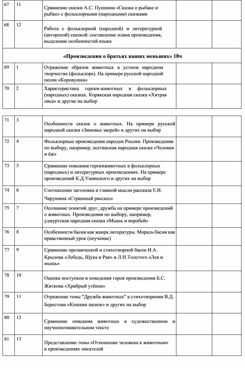Пришвина и др.). Отражение образов животных в фольклоре (русские народные песни, загадки, сказки). Герои стихотворных и прозаических произведений о животных. Описание животных в художественном и научно-познавательном тексте. Приёмы раскрытия автором отношений людей и животных. Нравственно-этические понятия: отношение человека к животным (любовь и забота). Особенности басни как жанра литературы, прозаические и стихотворные басни (на примере произведений И. А. Крылова, Л. Н. Толстого). Мораль басни как нравственный урок (поучение).
