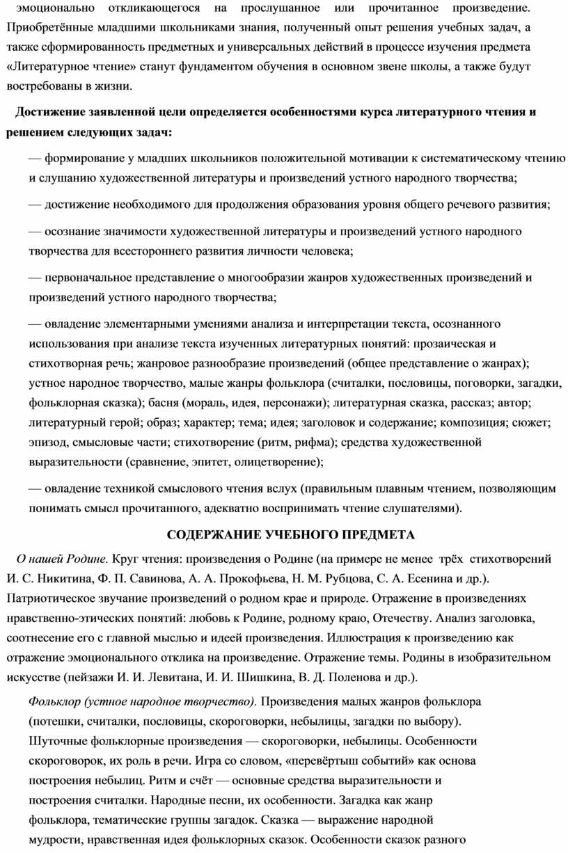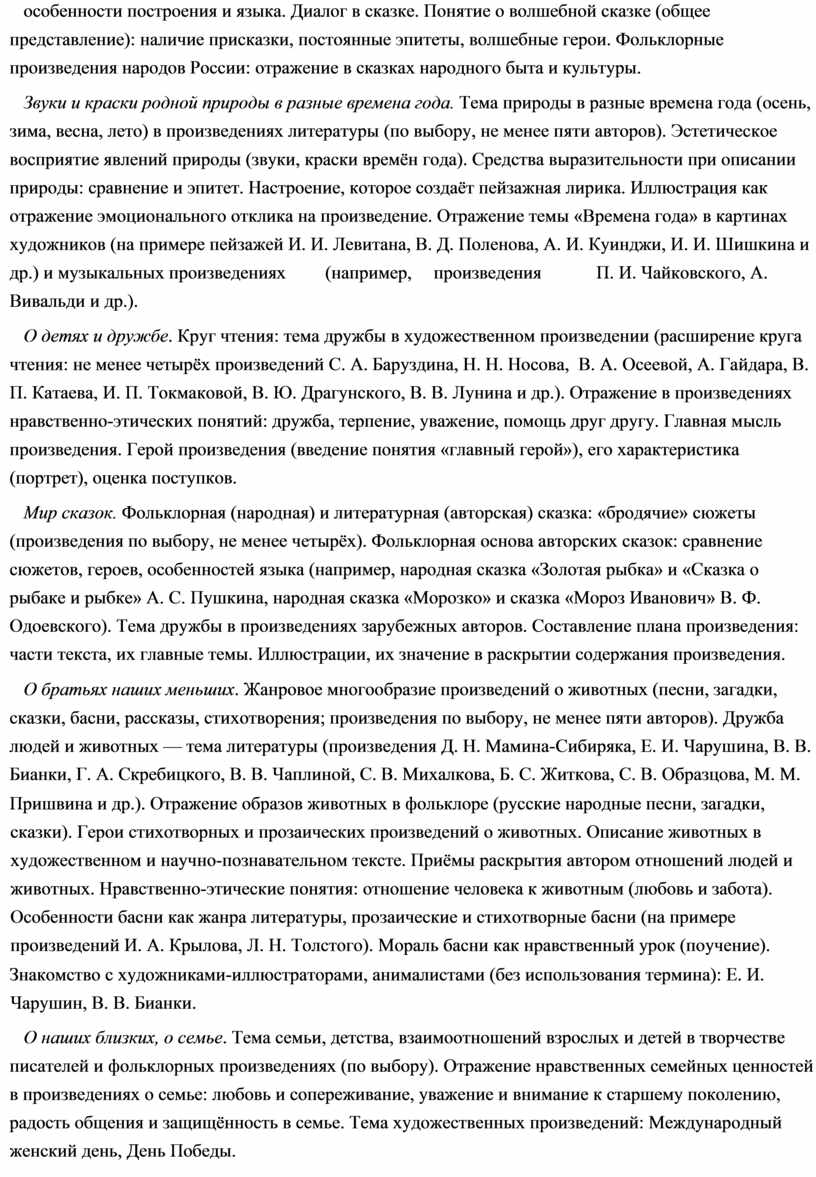 В основу отбора произведений положены общедидактические принципы обучения: соответствие возрастным возможностям и особенностям восприятия младшим школьником фольклорных произведений и литературных текстов; представленность в произведениях нравственно-эстетических ценностей, культурных традиций народов России, отдельных произведений выдающихся представителей мировой детской литературы; влияние прослушанного (прочитанного) произведения на эмоционально-эстетическое развитие обучающегося, на совершенствование его творческих способностей. При отборе произведений для слушания и чтения учитывались преемственные связи с дошкольным опытом знакомства с произведениями фольклора, художественными произведениями детской литературы, а также перспективы изучения предмета «Литература» в основной школе. Важным принципом отбора содержания предмета «Литературное чтение» является представленность разных жанров, видов и стилей произведений, обеспечивающих формирование функциональной литературной грамотности младшего школьника, а также возможность достижения метапредметных результатов, способности обучающегося воспринимать различные учебные тексты при изучении других предметов учебного плана начальной школы.