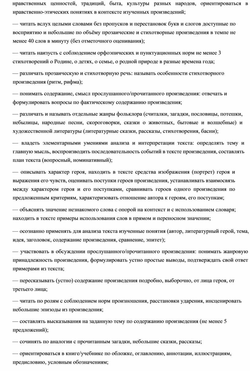 — овладение элементарными умениями анализа и интерпретации текста, осознанного использования при анализе текста изученных литературных понятий: прозаическая и стихотворная речь; жанровое разнообразие произведений (общее представление о жанрах); устное народное творчество, малые жанры фольклора (считалки, пословицы, поговорки, загадки, фольклорная сказка); басня (мораль, идея, персонажи); литературная сказка, рассказ; автор; литературный герой; образ; характер; тема; идея; заголовок и содержание; композиция; сюжет; эпизод, смысловые части; стихотворение (ритм, рифма); средства художественной выразительности (сравнение, эпитет, олицетворение);