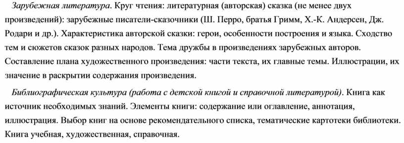 Зарубежная литература. Круг чтения: литературная (авторская) сказка (не менее двух произведений): зарубежные писатели-сказочники (Ш. Перро, братья Гримм, Х.-К. Андерсен, Дж. Родари и др.). Характеристика авторской сказки: герои, особенности построения и языка. Сходство тем и сюжетов сказок разных народов. Тема дружбы в произведениях зарубежных авторов.