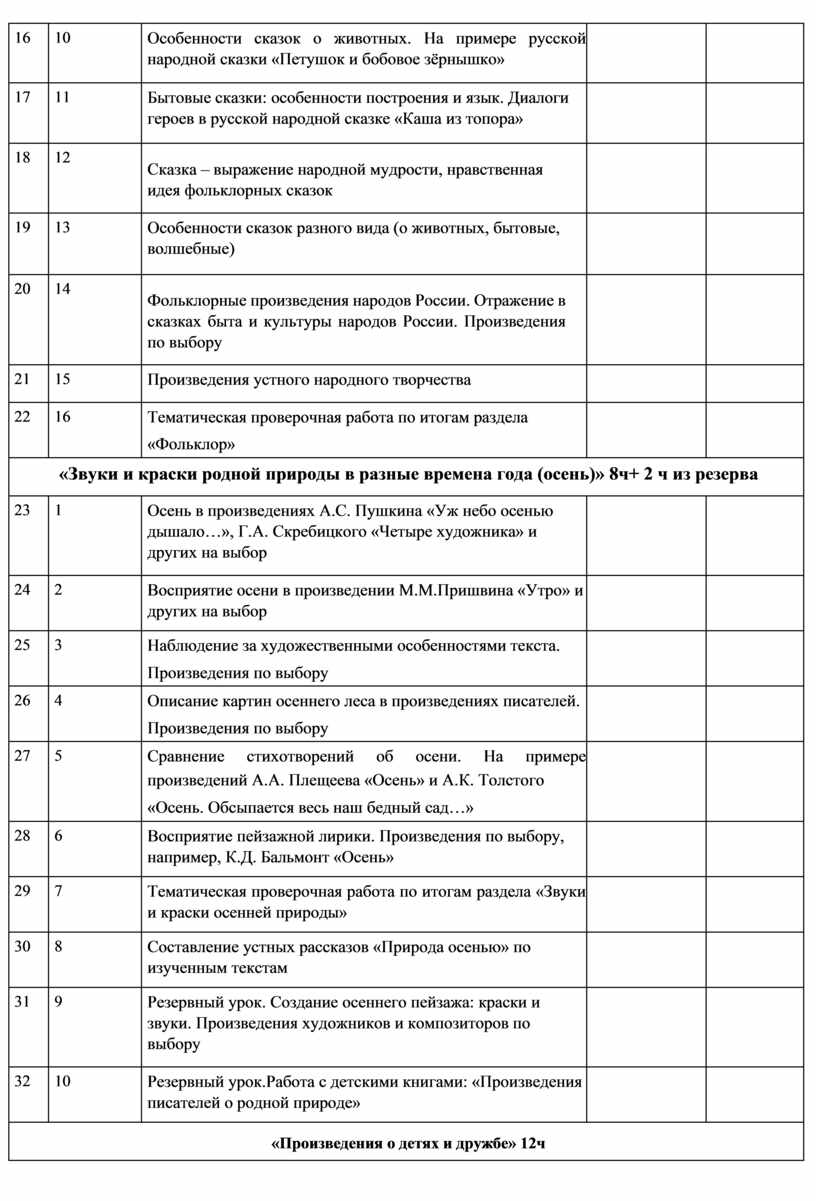 Звуки и краски родной природы в разные времена года. Тема природы в разные времена года (осень, зима, весна, лето) в произведениях литературы (по выбору, не менее пяти авторов). Эстетическое восприятие явлений природы (звуки, краски времён года). Средства выразительности при описании природы: сравнение и эпитет. Настроение, которое создаёт пейзажная лирика. Иллюстрация как отражение эмоционального отклика на произведение. Отражение темы «Времена года» в картинах художников (на примере пейзажей И. И. Левитана, В. Д. Поленова, А. И. Куинджи, И. И. Шишкина и др.) и музыкальных произведениях (например, произведения П. И. Чайковского, А. Вивальди и др.).