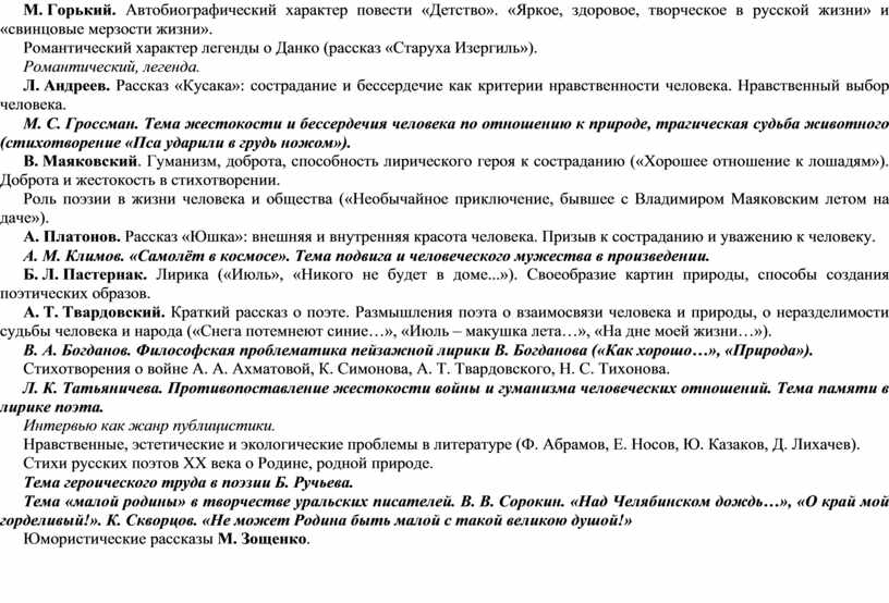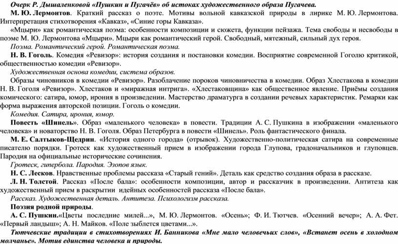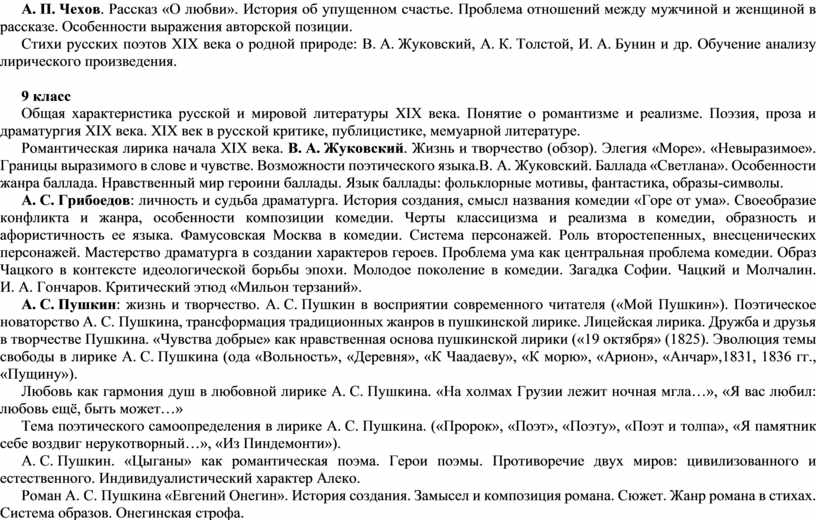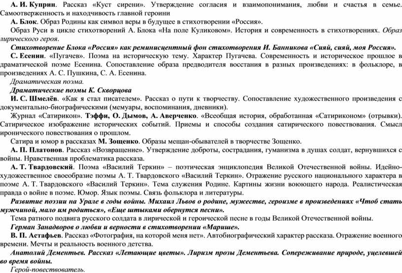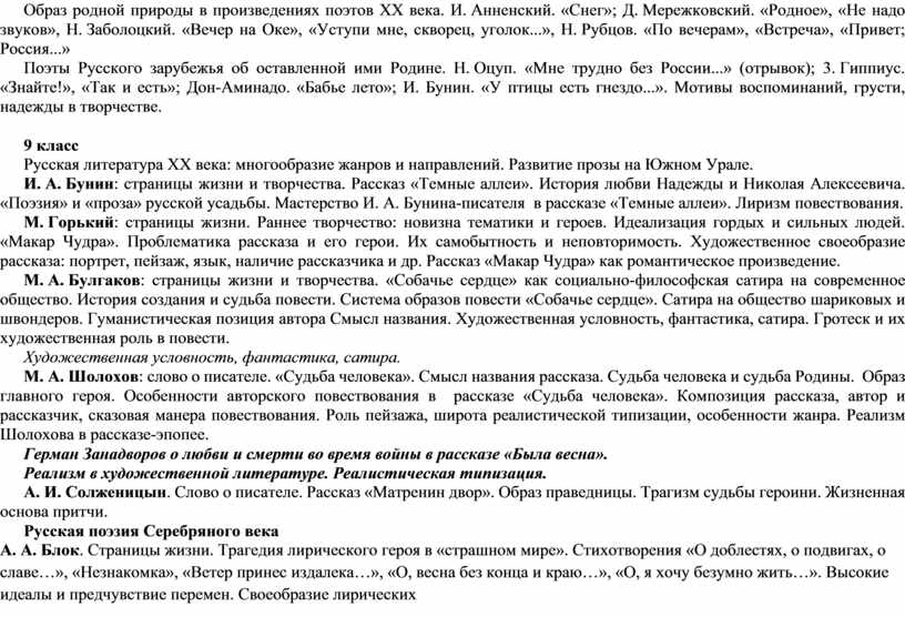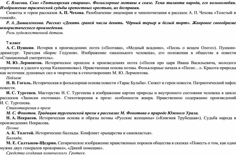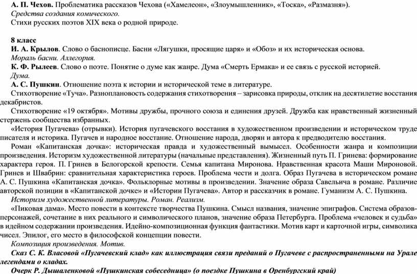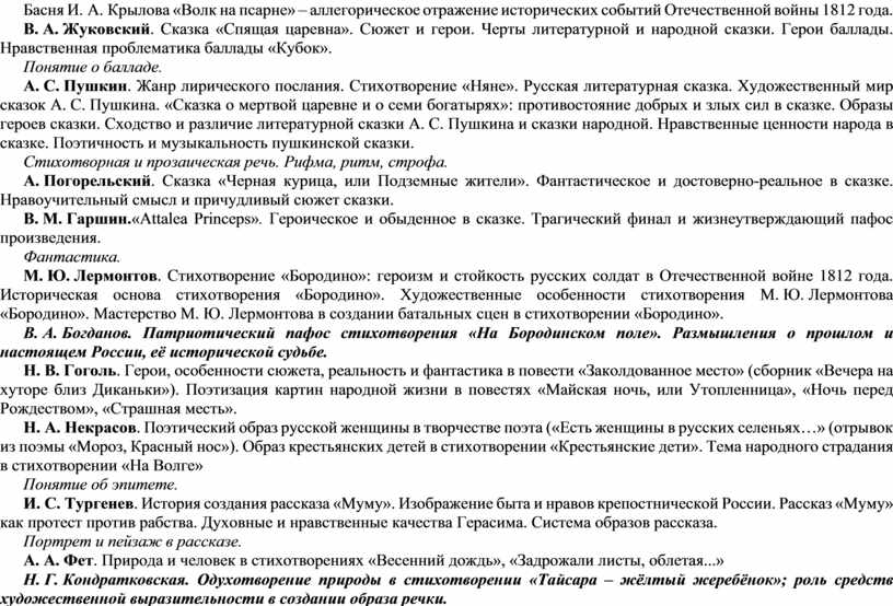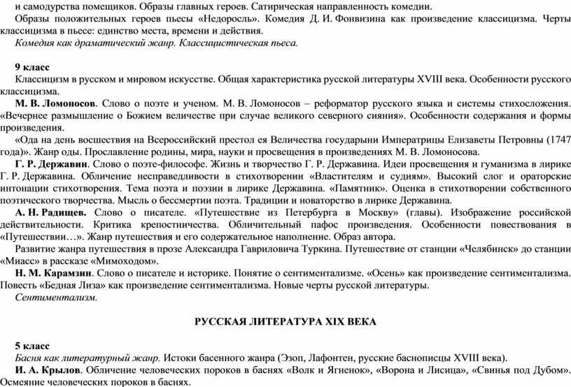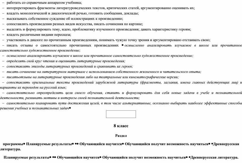 - характеризовать содержательные и художественные особенностей ведущих литературных направлений XVIII - XX веков; - характеризовать социокультурные особенности эпохи создания литературного произведения; - привлекать «фоновые» знания для формирования представления об эпохе создания литературного произведения; - определять место литературного произведения в историко-литературном процессе русской и мировой литературы; - собирать материал о биографии писателей, поэтов, драматургов, характеризовать особенности личности и мировоззрения создателя литературного произведения; - выявлять сквозные мотивы, образы, темы в произведениях русской и зарубежной литературы VIII-XX веков; - выявлять «вечные» мотивы, образы, темы в произведениях русской и зарубежной литературы VIII-XX веков; - проводить эстетический и смысловой анализ текста на основе понимания принципиальных отличий литературного художественного текста от текстов научного, делового, публицистического; - формировать умение воспринимать, анализировать, критически оценивать и интерпретировать прочитанное, осознавать художественную картину жизни, отраженную в литературном произведении, на уровне не только эмоционального восприятия, но и интеллектуального осмысления; - выделять и формулировать тему, идею, проблематику изученного произведения; давать характеристику героям; - характеризовать особенности сюжета, композиции, выявлять роль изобразительно-выразительных средств; - пользоваться основными теоретико-литературными терминами и понятиями как инструментом анализа и интерпретации художественного текста; - выделять смысловые части художественного текста, составлять тезисы и план прочитанного; - создавать связный текст (устный и письменный) на необходимую тему с учетом норм русского литературного языка; - создавать сочинения разных жанров по прочитанным произведениям; - давать устный или письменный ответ на вопрос по тексту произведения, в том числе с использованием цитирования; - подбирать цитаты из текста литературного произведения на заданную тему; - определять принадлежности произведения к одному из литературных родов (эпос, лирика, драма), к одному из жанров или жанровых образований (эпические и драматические тексты); - обосновывать свое суждение, составлять характеристики героев, аргументированный отзыв о прочитанном произведении; - выявлять роль героя, портрета, описания, детали, авторскую оценку в раскрытии содержании прочитанного произведения; - работать со справочным аппаратом учебника; - выявлять авторское отношение к героям, сопоставлять высказывания литературоведов, формулировать выводы; - правильно, бегло и выразительно читать тексты художественных и публицистических произведений; - владеть монологической и диалогической речью, готовить сообщения, доклады; - высказывать собственное суждение об иллюстрациях к произведению; - сопоставлять произведения разных видов искусства, писать сочинения по картине; - участвовать в диалоге по прочитанным произведениям, понимать чужую точку зрения и аргументировано отстаивать свою; - писать отзывы о самостоятельно прочитанных произведениях |