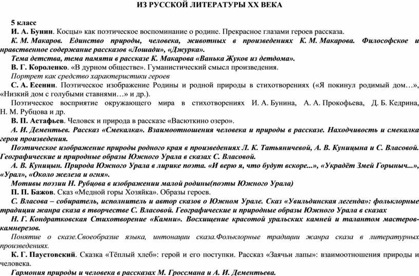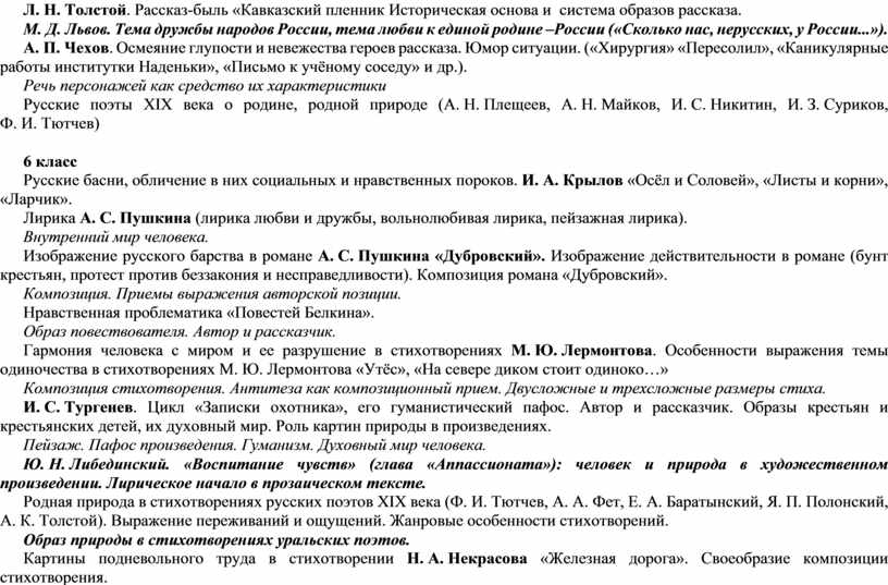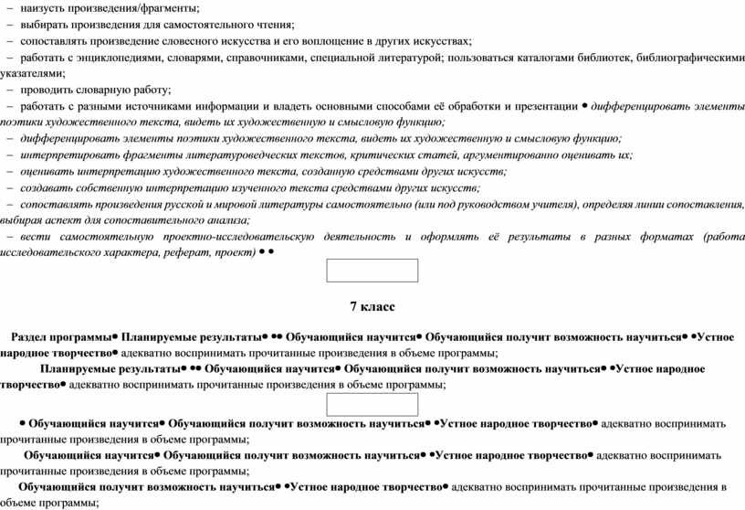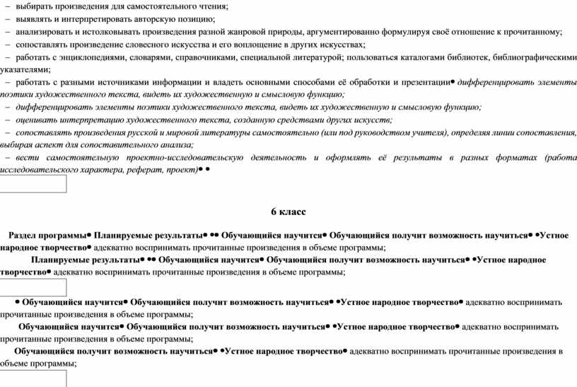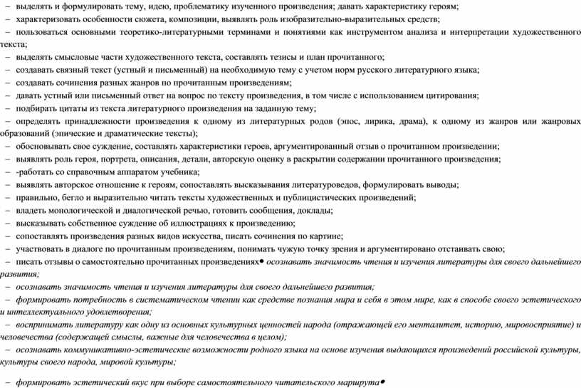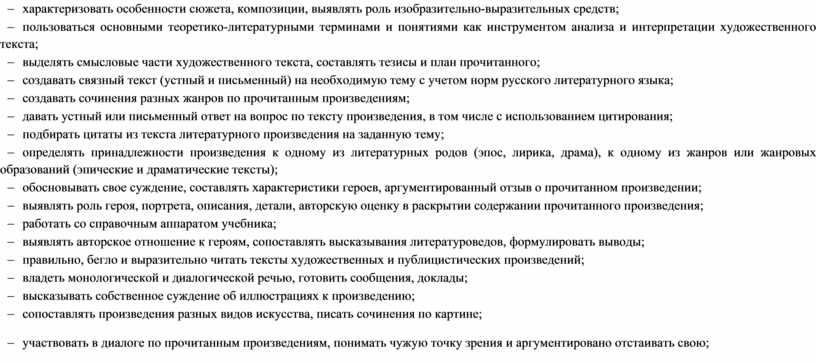 - понимать образную природу словесного искусства, содержание изученных литературных произведений; - воспринимать и анализировать художественный текст; - понимать влияние эпохи создания литературных произведений на их содержание; - проводить словарную работу при изучении текста художественного произведения; - правильно, бегло и выразительно читать тексты художественных и публицистических произведений; - создавать связный текст (устный и письменный) на необходимую тему с учетом норм русского литературного языка; - писать сочинения на литературную и свободную темы; - давать устный или письменный ответ на вопрос по тексту произведения, в том числе с использованием цитирования; - подбирать цитаты из текста литературного произведения на заданную тему; - выделять смысловые части художественного текста, составлять тезисы и план прочитанного; - определять принадлежности произведения к одному из литературных родов (эпос, лирика, драма), к одному из жанров или жанровых образований (эпические и драматические тексты); - выявлять авторское отношение к героям, обосновывать свое суждение, составлять характеристики героев, аргументированный отзыв о прочитанном произведении; - выявлять роль героя, портрета, описания, детали, авторскую оценку в раскрытии содержании прочитанного произведения; - характеризовать особенности сюжета, композиции, выявлять роль изобразительно-выразительных средств; - работать со справочным аппаратом учебника; - интерпретировать фрагменты литературоведческих текстов, критических статей, аргументированно оценивать их; - владеть монологической и диалогической речью, готовить сообщения, доклады; - высказывать собственное суждение об иллюстрациях к произведению; - сопоставлять произведения разных видов искусства, писать сочинения по картине; - выделять и формулировать тему, идею, проблематику изученного произведения; давать характеристику героям; - владеть различными видами пересказа; - участвовать в диалоге по прочитанным произведениям, понимать чужую точку зрения и аргументировано отстаивать свою; - писать отзывы о самостоятельно прочитанных произведениях |