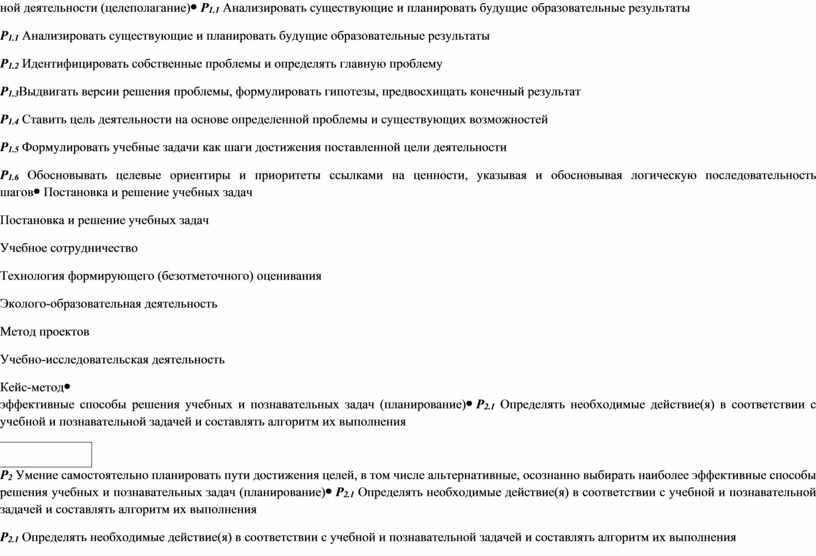 Р1.1 Анализировать существующие и планировать будущие образовательные результаты Р1.2 Идентифицировать собственные проблемы и определять главную проблему Р1.3Выдвигать версии решения проблемы, формулировать гипотезы, предвосхищать конечный результат Р1.4 Ставить цель деятельности на основе определенной проблемы и существующих возможностей Р1.5 Формулировать учебные задачи как шаги достижения поставленной цели деятельности Р1.6 Обосновывать целевые ориентиры и приоритеты ссылками на ценности, указывая и обосновывая логическую последовательность шагов |