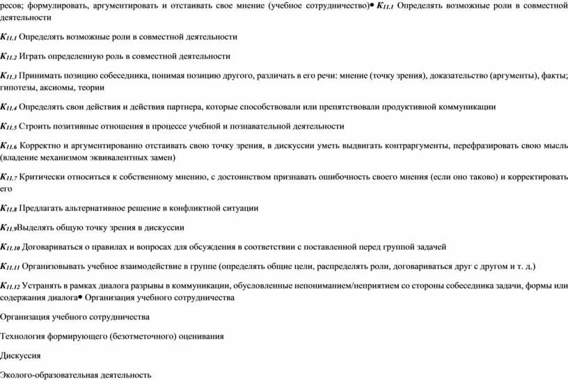 К11.1 Определять возможные роли в совместной деятельности К11.2 Играть определенную роль в совместной деятельности К11.3 Принимать позицию собеседника, понимая позицию другого, различать в его речи: мнение (точку зрения), доказательство (аргументы), факты; гипотезы, аксиомы, теории К11.4 Определять свои действия и действия партнера, которые способствовали или препятствовали продуктивной коммуникации К11.5 Строить позитивные отношения в процессе учебной и познавательной деятельности К11.6 Корректно и аргументированно отстаивать свою точку зрения, в дискуссии уметь выдвигать контраргументы, перефразировать свою мысль (владение механизмом эквивалентных замен) К11.7 Критически относиться к собственному мнению, с достоинством признавать ошибочность своего мнения (если оно таково) и корректировать его К11.8 Предлагать альтернативное решение в конфликтной ситуации К11.9Выделять общую точку зрения в дискуссии К11.10 Договариваться о правилах и вопросах для обсуждения в соответствии с поставленной перед группой задачей К11.11 Организовывать учебное взаимодействие в группе (определять общие цели, распределять роли, договариваться друг с другом и т. д.) К11.12 Устранять в рамках диалога разрывы в коммуникации, обусловленные непониманием/неприятием со стороны собеседника задачи, формы или содержания диалога |