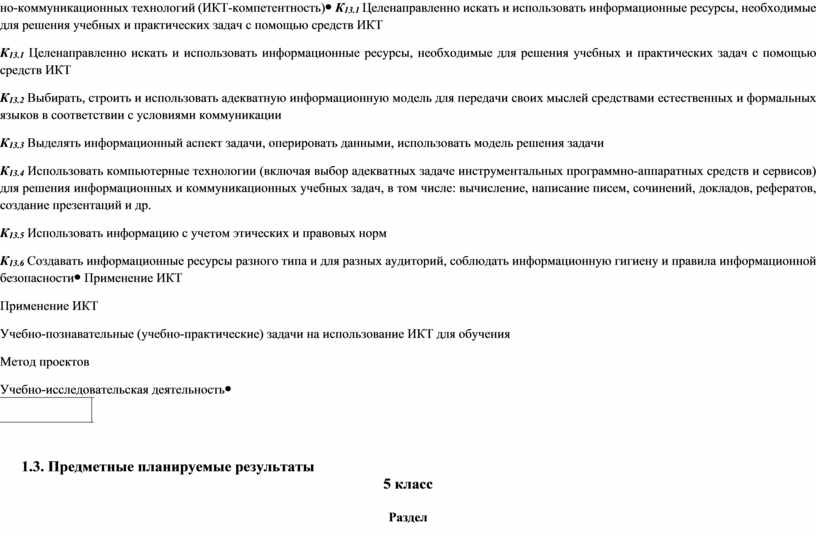 К13.1 Целенаправленно искать и использовать информационные ресурсы, необходимые для решения учебных и практических задач с помощью средств ИКТ К13.2 Выбирать, строить и использовать адекватную информационную модель для передачи своих мыслей средствами естественных и формальных языков в соответствии с условиями коммуникации К13.3 Выделять информационный аспект задачи, оперировать данными, использовать модель решения задачи К13.4 Использовать компьютерные технологии (включая выбор адекватных задаче инструментальных программно-аппаратных средств и сервисов) для решения информационных и коммуникационных учебных задач, в том числе: вычисление, написание писем, сочинений, докладов, рефератов, создание презентаций и др. К13.5 Использовать информацию с учетом этических и правовых норм К13.6 Создавать информационные ресурсы разного типа и для разных аудиторий, соблюдать информационную гигиену и правила информационной безопасности |