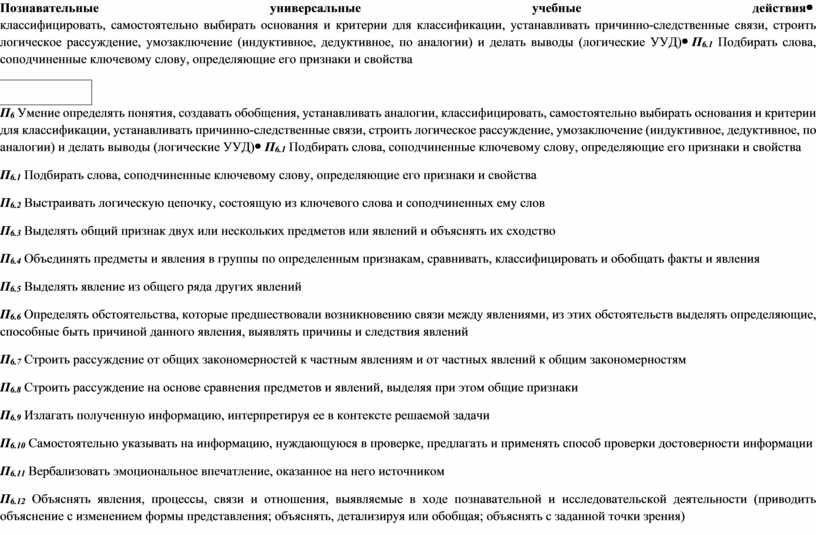 П6.1 Подбирать слова, соподчиненные ключевому слову, определяющие его признаки и свойства П6.2 Выстраивать логическую цепочку, состоящую из ключевого слова и соподчиненных ему слов П6.3 Выделять общий признак двух или нескольких предметов или явлений и объяснять их сходство П6.4 Объединять предметы и явления в группы по определенным признакам, сравнивать, классифицировать и обобщать факты и явления П6.5 Выделять явление из общего ряда других явлений П6.6 Определять обстоятельства, которые предшествовали возникновению связи между явлениями, из этих обстоятельств выделять определяющие, способные быть причиной данного явления, выявлять причины и следствия явлений П6.7 Строить рассуждение от общих закономерностей к частным явлениям и от частных явлений к общим закономерностям П6.8 Строить рассуждение на основе сравнения предметов и явлений, выделяя при этом общие признаки П6.9 Излагать полученную информацию, интерпретируя ее в контексте решаемой задачи П6.10 Самостоятельно указывать на информацию, нуждающуюся в проверке, предлагать и применять способ проверки достоверности информации П6.11 Вербализовать эмоциональное впечатление, оказанное на него источником П6.12 Объяснять явления, процессы, связи и отношения, выявляемые в ходе познавательной и исследовательской деятельности (приводить объяснение с изменением формы представления; объяснять, детализируя или обобщая; объяснять с заданной точки зрения) П6.13 Выявлять и называть причины события, явления, в том числе возможные / наиболее вероятные причины, возможные последствия заданной причины, самостоятельно осуществляя причинно-следственный анализ П6.14 Делать вывод на основе критического анализа разных точек зрения, подтверждать вывод собственной аргументацией или самостоятельно полученными данными |