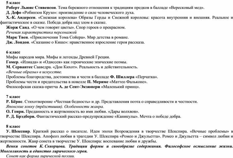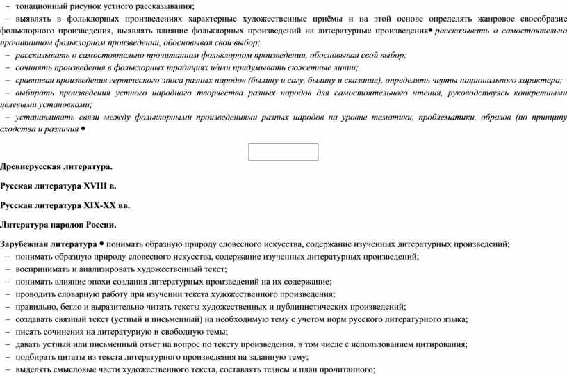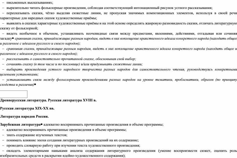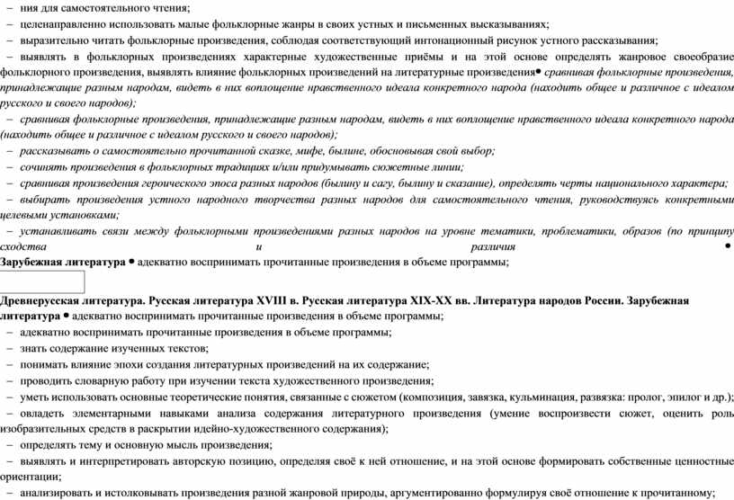 - адекватно воспринимать прочитанные произведения в объеме программы; - знать содержание изученных текстов; - понимать влияние эпохи создания литературных произведений на их содержание; - проводить словарную работу при изучении текста художественного произведения; - овладеть элементарными навыками анализа содержания литературного произведения (умение воспроизвести сюжет, оценить роль изобразительных средств в раскрытии идейно-художественного содержания); - уметь использовать основные теоретические понятия, связанные с сюжетом (композиция, завязка, кульминация, развязка: пролог, эпилог и др.); - определять тему и основную мысль произведения; - адекватно понимать художественный текст и давать его смысловой анализ; - владеть различными видами пересказа; - характеризовать героев-персонажей, давать их сравнительные характеристики; - выразительно читать с листа и наизусть произведения/фрагменты; - выбирать произведения для самостоятельного чтения; - выявлять и интерпретировать авторскую позицию; - анализировать и истолковывать произведения разной жанровой природы, аргументированно формулируя своё отношение к прочитанному; - сопоставлять произведение словесного искусства и его воплощение в других искусствах; - работать с энциклопедиями, словарями, справочниками, специальной литературой; пользоваться каталогами библиотек, библиографическими указателями; - работать с разными источниками информации и владеть основными способами её обработки и презентации |