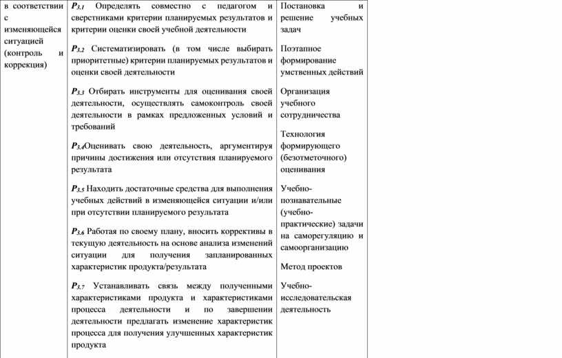 Р3.1 Определять совместно с педагогом и сверстниками критерии планируемых результатов и критерии оценки своей учебной деятельности Р3.2 Систематизировать (в том числе выбирать приоритетные) критерии планируемых результатов и оценки своей деятельности Р3.3 Отбирать инструменты для оценивания своей деятельности, осуществлять самоконтроль своей деятельности в рамках предложенных условий и требований Р3.4Оценивать свою деятельность, аргументируя причины достижения или отсутствия планируемого результата Р3.5 Находить достаточные средства для выполнения учебных действий в изменяющейся ситуации и/или при отсутствии планируемого результата Р3.6 Работая по своему плану, вносить коррективы в текущую деятельность на основе анализа изменений ситуации для получения запланированных характеристик продукта/результата Р3.7 Устанавливать связь между полученными характеристиками продукта и характеристиками процесса деятельности и по завершении деятельности предлагать изменение характеристик процесса для получения улучшенных характеристик продукта Р3.8 Сверять свои действия с целью и, при необходимости, исправлять ошибки самостоятельно |