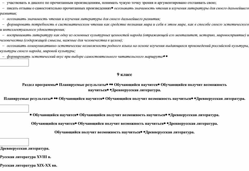 - характеризовать содержательные и художественные особенностей ведущих литературных направлений XVIII - XX веков; - характеризовать социокультурные особенности эпохи создания литературного произведения; - привлекать «фоновые» знания для формирования представления об эпохе создания литературного произведения; - проводить эстетический и смысловой анализ текста на основе понимания принципиальных отличий литературного художественного текста от текстов научного, делового, публицистического; - формировать умение воспринимать, анализировать, критически оценивать и интерпретировать прочитанное, осознавать художественную картину жизни, отраженную в литературном произведении, на уровне не только эмоционального восприятия, но и интеллектуального осмысления; - выделять и формулировать тему, идею, проблематику изученного произведения; давать характеристику героям; - характеризовать особенности сюжета, композиции, выявлять роль изобразительно-выразительных средств; - пользоваться основными теоретико-литературными терминами и понятиями как инструментом анализа и интерпретации художественного текста; - выделять смысловые части художественного текста, составлять тезисы и план прочитанного; - создавать связный текст (устный и письменный) на необходимую тему с учетом норм русского литературного языка; - создавать сочинения разных жанров по прочитанным произведениям; - давать устный или письменный ответ на вопрос по тексту произведения, в том числе с использованием цитирования; - подбирать цитаты из текста литературного произведения на заданную тему; - определять принадлежности произведения к одному из литературных родов (эпос, лирика, драма), к одному из жанров или жанровых образований (эпические и драматические тексты); - обосновывать свое суждение, составлять характеристики героев, аргументированный отзыв о прочитанном произведении; - выявлять роль героя, портрета, описания, детали, авторскую оценку в раскрытии содержании прочитанного произведения; - -работать со справочным аппаратом учебника; - выявлять авторское отношение к героям, сопоставлять высказывания литературоведов, формулировать выводы; - правильно, бегло и выразительно читать тексты художественных и публицистических произведений; - владеть монологической и диалогической речью, готовить сообщения, доклады; - высказывать собственное суждение об иллюстрациях к произведению; - сопоставлять произведения разных видов искусства, писать сочинения по картине; - участвовать в диалоге по прочитанным произведениям, понимать чужую точку зрения и аргументировано отстаивать свою; - писать отзывы о самостоятельно прочитанных произведениях |