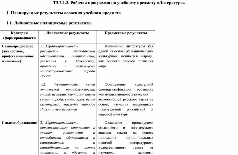 Т2.2.1.2. Рабочая программа по учебному предмету «Литература»