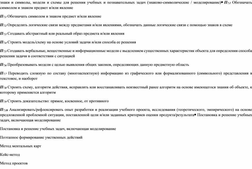 П7.1 Обозначать символом и знаком предмет и/или явление П7.2 Определять логические связи между предметами и/или явлениями, обозначать данные логические связи с помощью знаков в схеме П7.3 Создавать абстрактный или реальный образ предмета и/или явления П7.4 Строить модель/схему на основе условий задачи и/или способа ее решения П7.5 Создавать вербальные, вещественные и информационные модели с выделением существенных характеристик объекта для определения способа решения задачи в соответствии с ситуацией П7.6 Преобразовывать модели с целью выявления общих законов, определяющих данную предметную область П7.7 Переводить сложную по составу (многоаспектную) информацию из графического или формализованного (символьного) представления в текстовое, и наоборот П7.8 Строить схему, алгоритм действия, исправлять или восстанавливать неизвестный ранее алгоритм на основе имеющегося знания об объекте, к которому применяется алгоритм П7.9 Строить доказательство: прямое, косвенное, от противного П7.10 Анализировать/рефлексировать опыт разработки и реализации учебного проекта, исследования (теоретического, эмпирического) на основе предложенной проблемной ситуации, поставленной цели и/или заданных критериев оценки продукта/результата |
