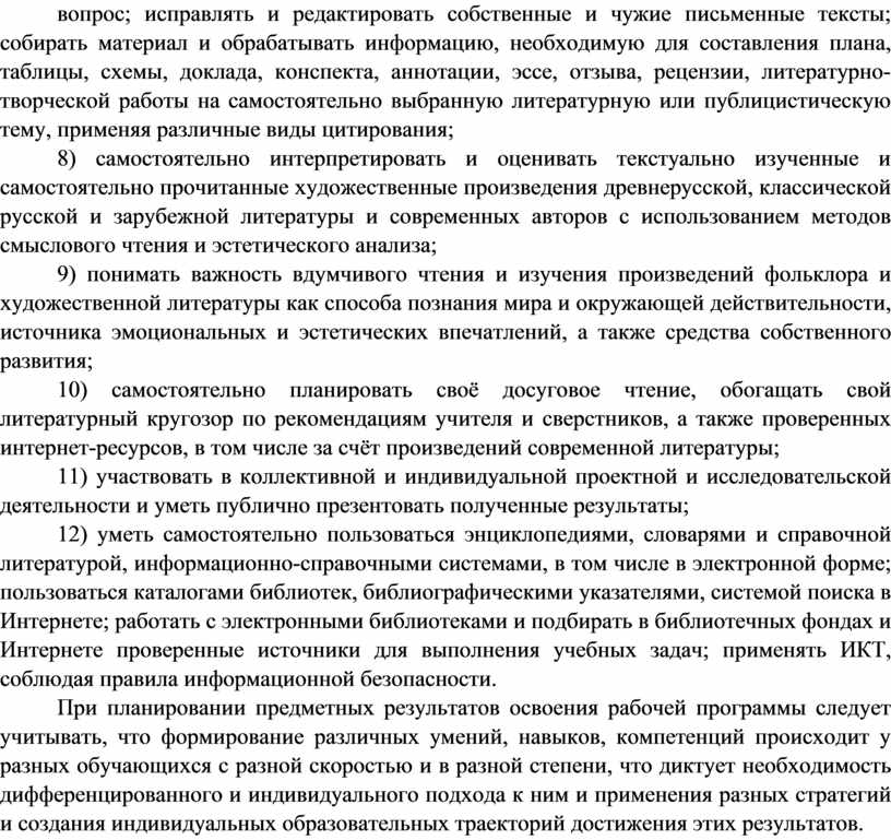 В рабочей программе учтены все этапы российского историко-литературного процесса (от фольклора до новейшей русской литературы) и представлены разделы, касающиеся отечественной и зарубежной литературы. Основные виды деятельности обучающихся перечислены при изучении каждой монографической или обзорной темы и направлены на достижение планируемых результатов обучения.