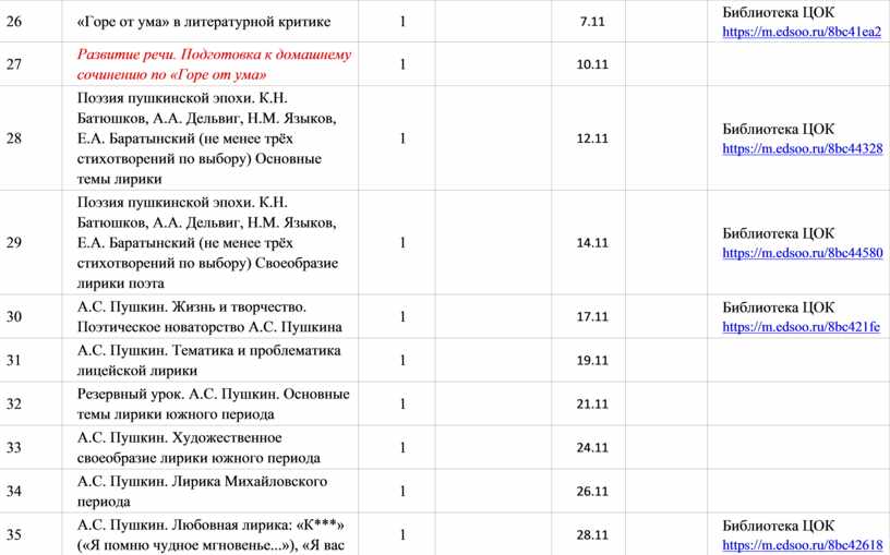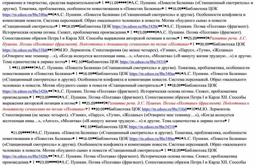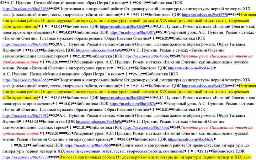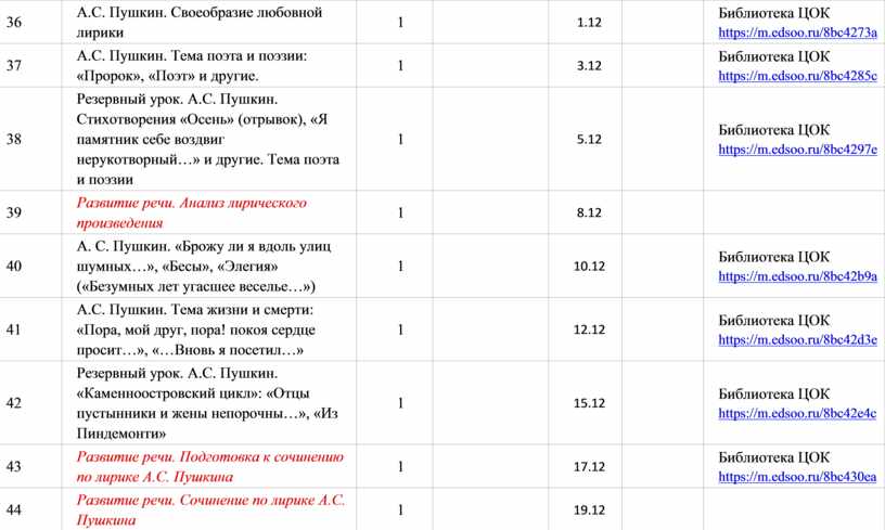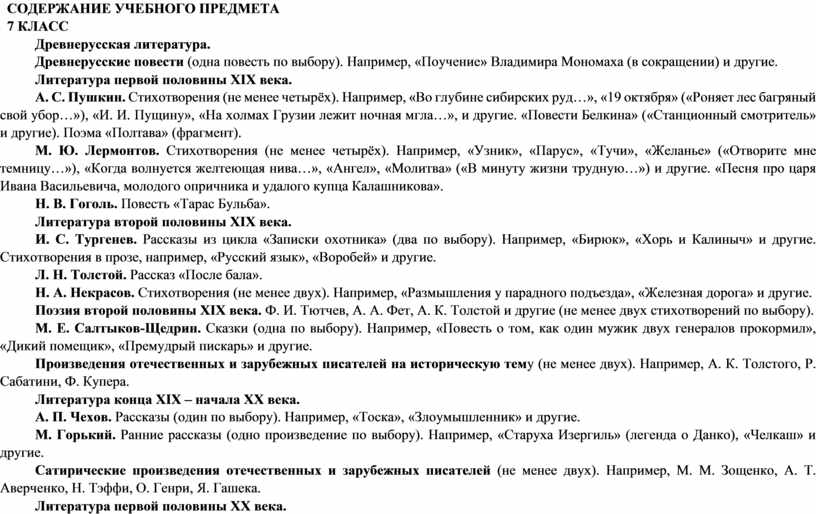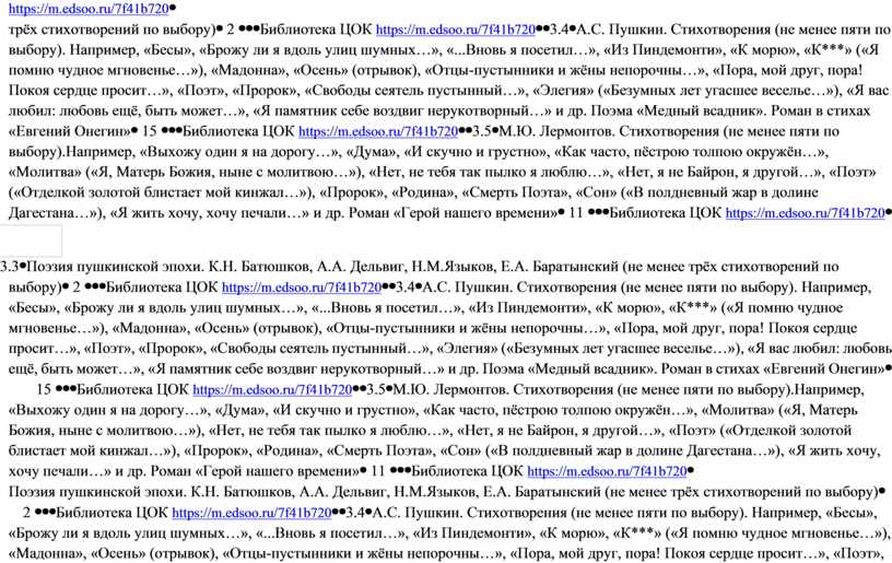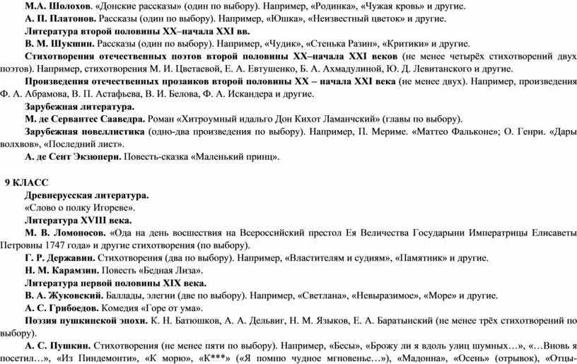 А. С. Пушкин. Стихотворения (не менее пяти по выбору). Например, «Бесы», «Брожу ли я вдоль улиц шумных…», «…Вновь я посетил…», «Из Пиндемонти», «К морю», «К***» («Я помню чудное мгновенье…»), «Мадонна», «Осень» (отрывок), «Отцы-пустынники и жёны непорочны…», «Пора, мой друг, пора! Покоя сердце просит…», «Поэт», «Пророк», «Свободы сеятель пустынный…», «Элегия» («Безумных лет угасшее веселье…»), «Я вас любил: любовь ещё, быть может…», «Я памятник себе воздвиг нерукотворный…» и другие. Поэма «Медный всадник». Роман в стихах «Евгений Онегин».
