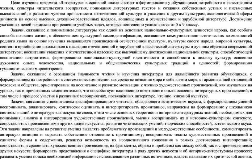 Цели изучения предмета «Литература» в основной школе состоят в формировании у обучающихся потребности в качественном чтении, культуры читательского восприятия, понимания литературных текстов и создания собственных устных и письменных высказываний; в развитии чувства причастности к отечественной культуре и уважения к другим культурам, аксиологической сферы личности на основе высоких духовно-нравственных идеалов, воплощённых в отечественной и зарубежной литературе. Достижение указанных целей возможно при решении учебных задач, которые постепенно усложняются от 5 к 9 классу.