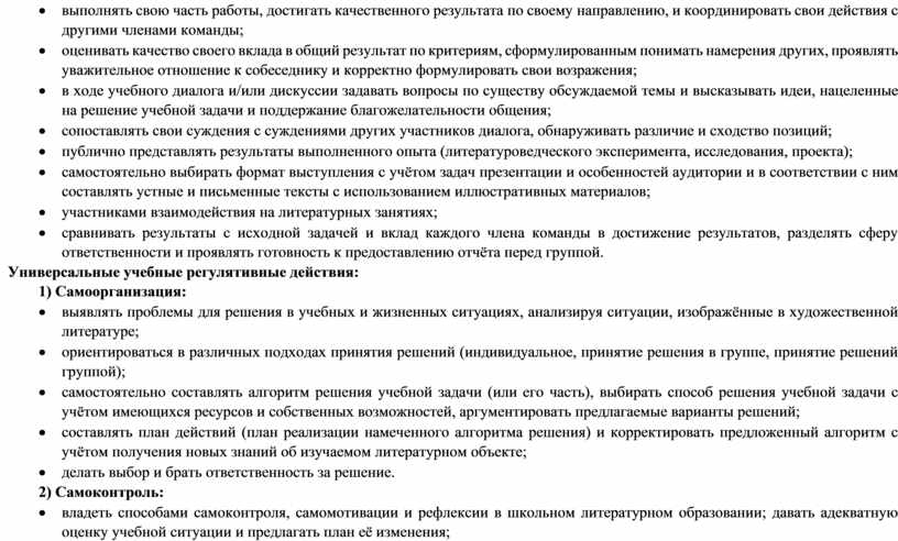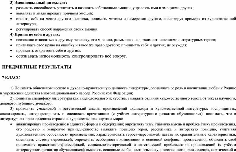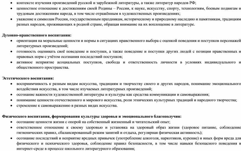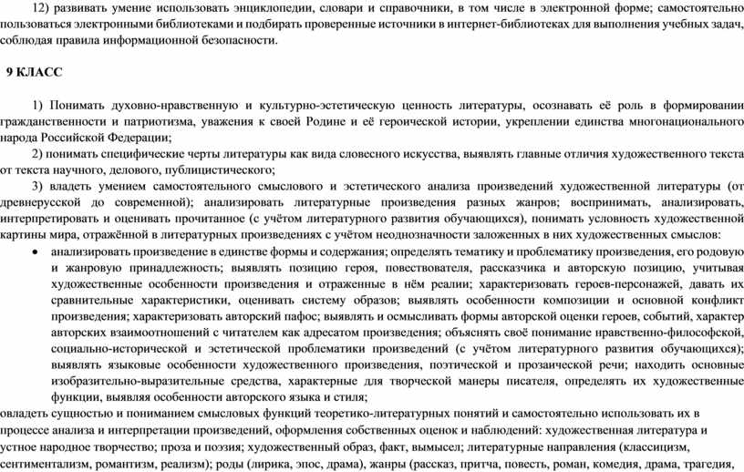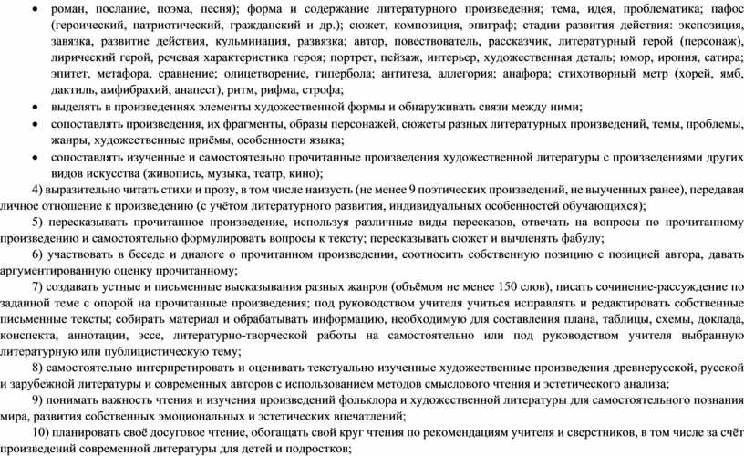 Основу содержания литературного образования составляют чтение и изучение выдающихся художественных произведений русской и мировой литературы, что способствует постижению таких нравственных категорий, как добро, справедливость, честь, патриотизм, гуманизм, дом, семья. Целостное восприятие и понимание художественного произведения, его анализ и интерпретация возможны лишь при соответствующей эмоционально-эстетической реакции читателя, которая зависит от возрастных особенностей школьников, их психического и литературного развития, жизненного и читательского опыта.