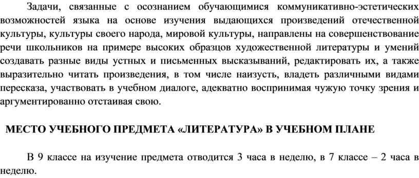 Задачи, связанные с пониманием литературы как одной из основных национально-культурных ценностей народа, как особого способа познания жизни, с обеспечением культурной самоидентификации, осознанием коммуникативно-эстетических возможностей родного языка на основе изучения выдающихся произведений отечественной культуры, культуры своего народа, мировой культуры, состоят в приобщении школьников к наследию отечественной и зарубежной классической литературы и лучшим образцам современной литературы; воспитании уважения к отечественной классике как высочайшему достижению национальной культуры, способствующей воспитанию патриотизма, формированию национально-культурной идентичности и способности к диалогу культур; освоению духовного опыта человечества, национальных и общечеловеческих культурных традиций и ценностей; формированию гуманистического мировоззрения.