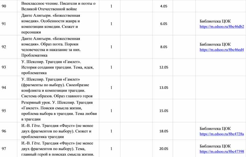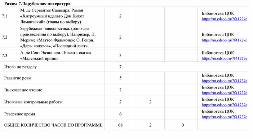 Произведения зарубежной литературы: по выбору (в том числе Гомера, М. Сервантеса, У. Шекспира, Ж.-Б. Мольера) |
