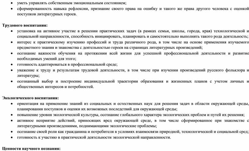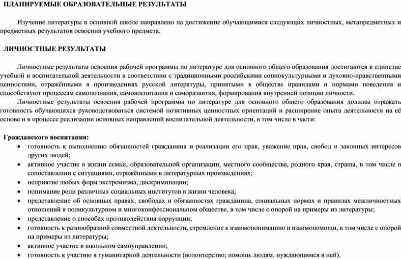 Личностные результаты освоения рабочей программы по литературе для основного общего образования достигаются в единстве учебной и воспитательной деятельности в соответствии с традиционными российскими социокультурными и духовно-нравственными ценностями, отражёнными в произведениях русской литературы, принятыми в обществе правилами и нормами поведения и способствуют процессам самопознания, самовоспитания и саморазвития, формирования внутренней позиции личности.