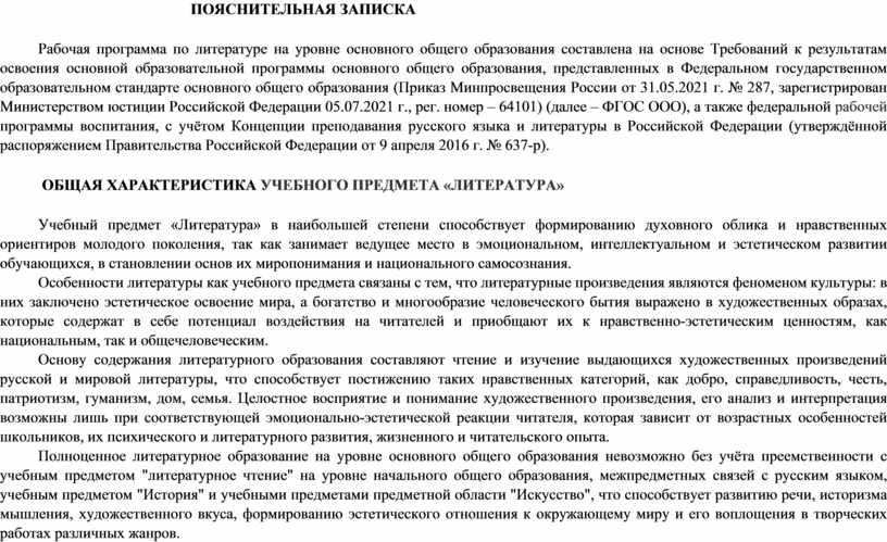 Рабочая программа по литературе на уровне основного общего образования составлена на основе Требований к результатам освоения основной образовательной программы основного общего образования, представленных в Федеральном государственном образовательном стандарте основного общего образования (Приказ Минпросвещения России от 31.05.2021 г. № 287, зарегистрирован Министерством юстиции Российской Федерации 05.07.2021 г., рег. номер – 64101) (далее – ФГОС ООО), а также федеральной рабочей программы воспитания, с учётом Концепции преподавания русского языка и литературы в Российской Федерации (утверждённой распоряжением Правительства Российской Федерации от 9 апреля 2016 г. № 637-р).
