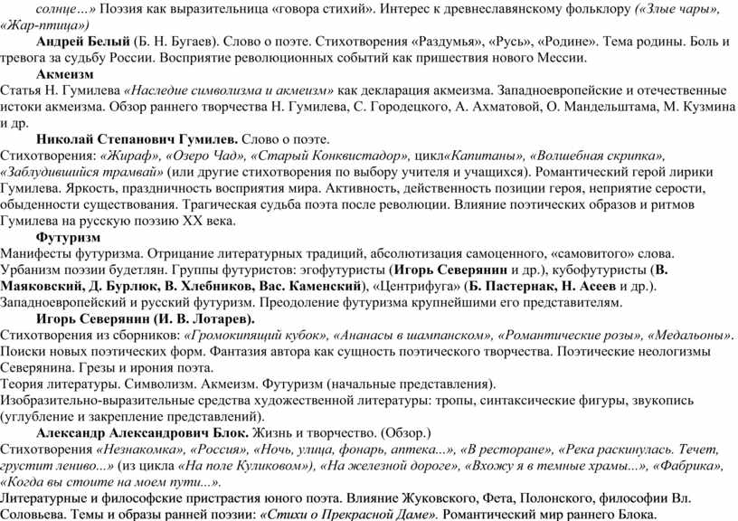 Развитие художественных и идейно-нравственных традиций русской классической литературы. Своеобразие реализма в русской литературе начала XX века. Человек и эпоха - основная проблема искусства. Направления философской мысли начала столетия, сложность отражения этих направлений в различных видах искусства. Реализм и модернизм, разнообразие литературных стилей, школ, групп.