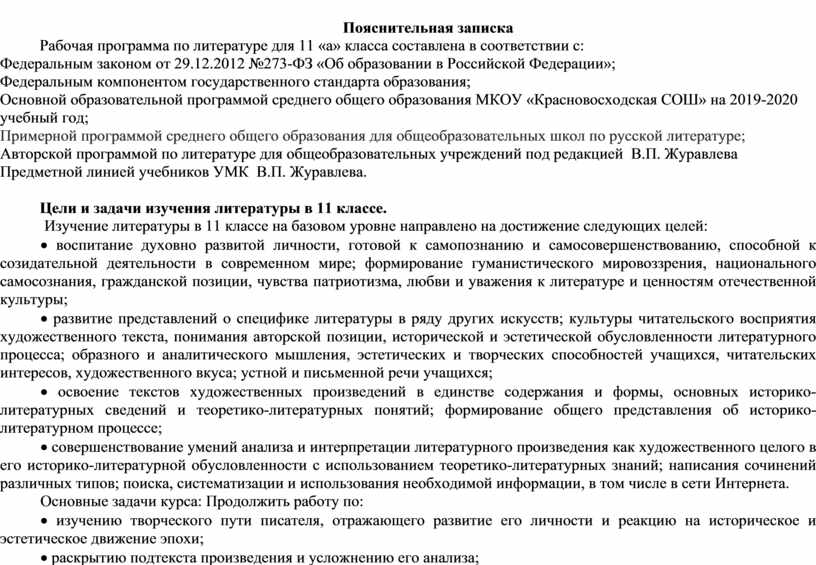 Рабочая программа по литературе для 11 «а» класса составлена в соответствии с: