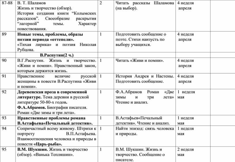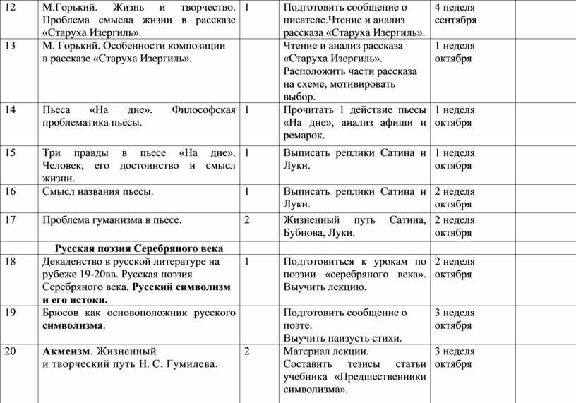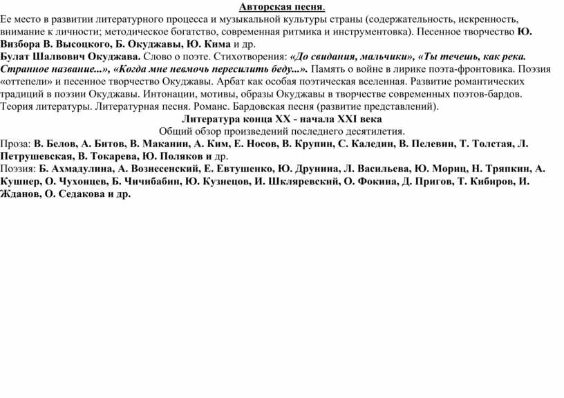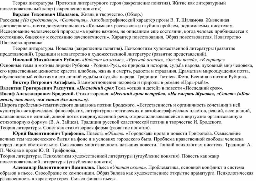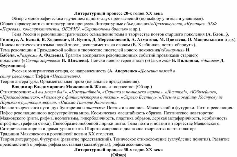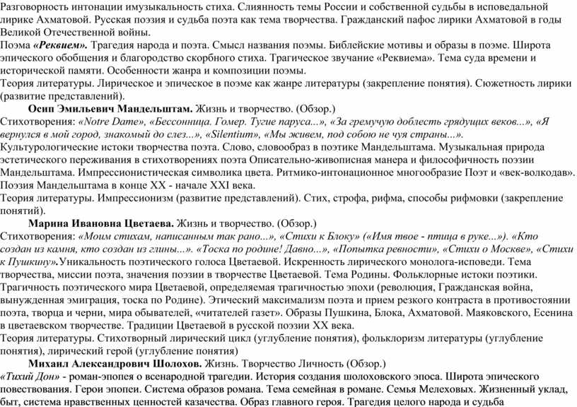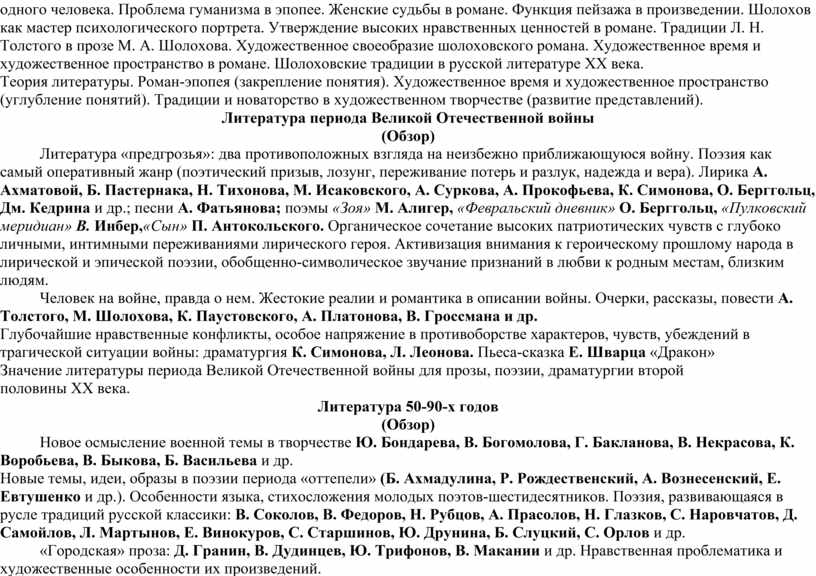 Русская литература в контексте мировой художественной культуры XX столетия. Литература и глобальные исторические потрясения в судьбе России в XX веке. Три основных направления, в русле которых протекало развитие русской литературы: русская советская литература; литература, официально не признанная властью; литература Русского зарубежья. Различное и общее: что противопоставляло и что объединяло разные потоки русской литературы. Основные темы и проблемы. Проблема нравственного выбора человека и проблема ответственности. Тема исторической памяти, национального самосознания. Поиск нравственного и эстетического идеалов.