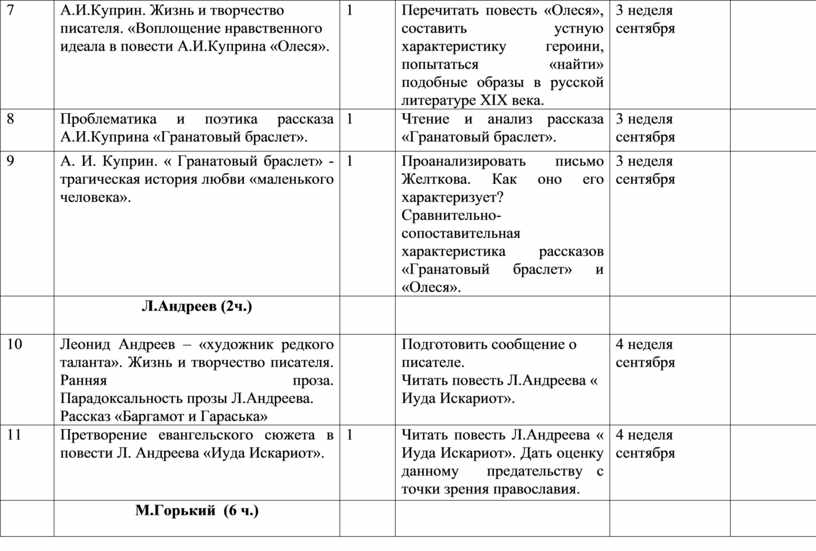 Повесть «Олеся», рассказ «Гранатовый браслет». Поэтическое изображение природы в повести «Олеся», богатство духовного мира героини. Мечты Олеси и реальная жизнь деревни и ее обитателей. Толстовские традиции в прозе Куприна. Любовь как высшая ценность мира в рассказе «Гранатовый браслет». Трагическая история любви Желткова и пробуждение души Веры Шейной. Поэтика рассказа. Символическое звучание детали в прозе Куприна. Роль сюжета в повестях и рассказах писателя. Традиции русской психологической прозы в творчестве А. И. Куприна.