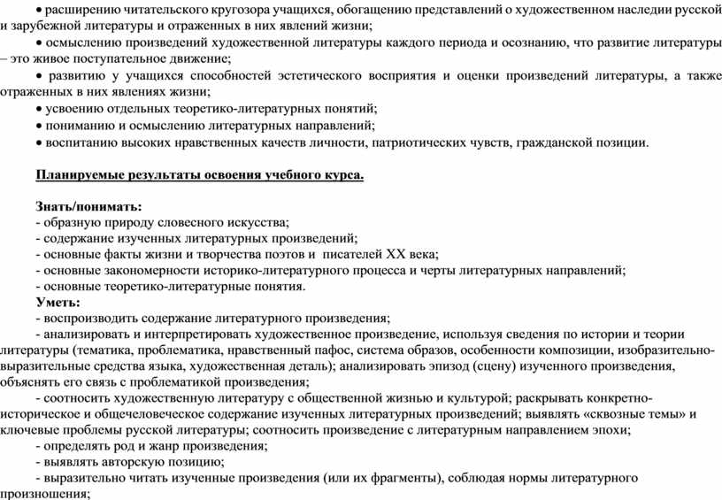 · воспитание духовно развитой личности, готовой к самопознанию и самосовершенствованию, способной к созидательной деятельности в современном мире; формирование гуманистического мировоззрения, национального самосознания, гражданской позиции, чувства патриотизма, любви и уважения к литературе и ценностям отечественной культуры;