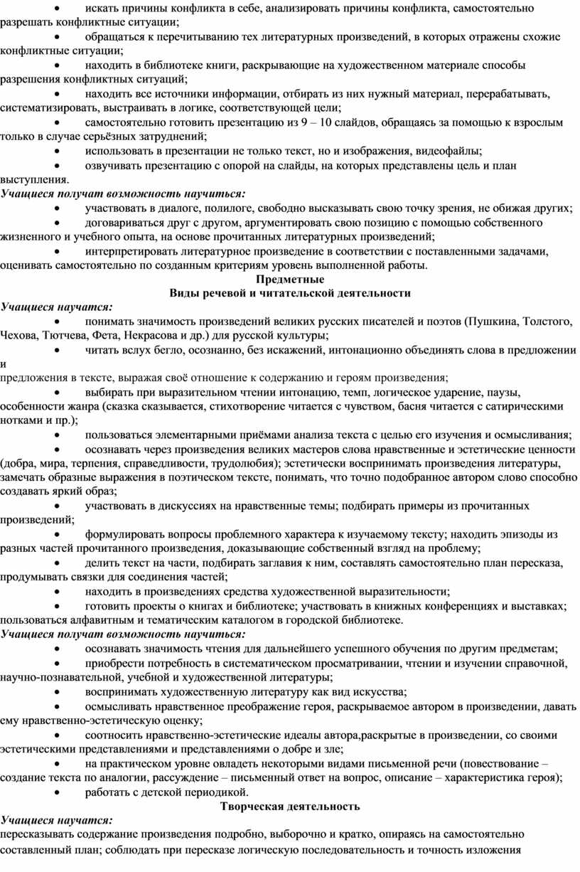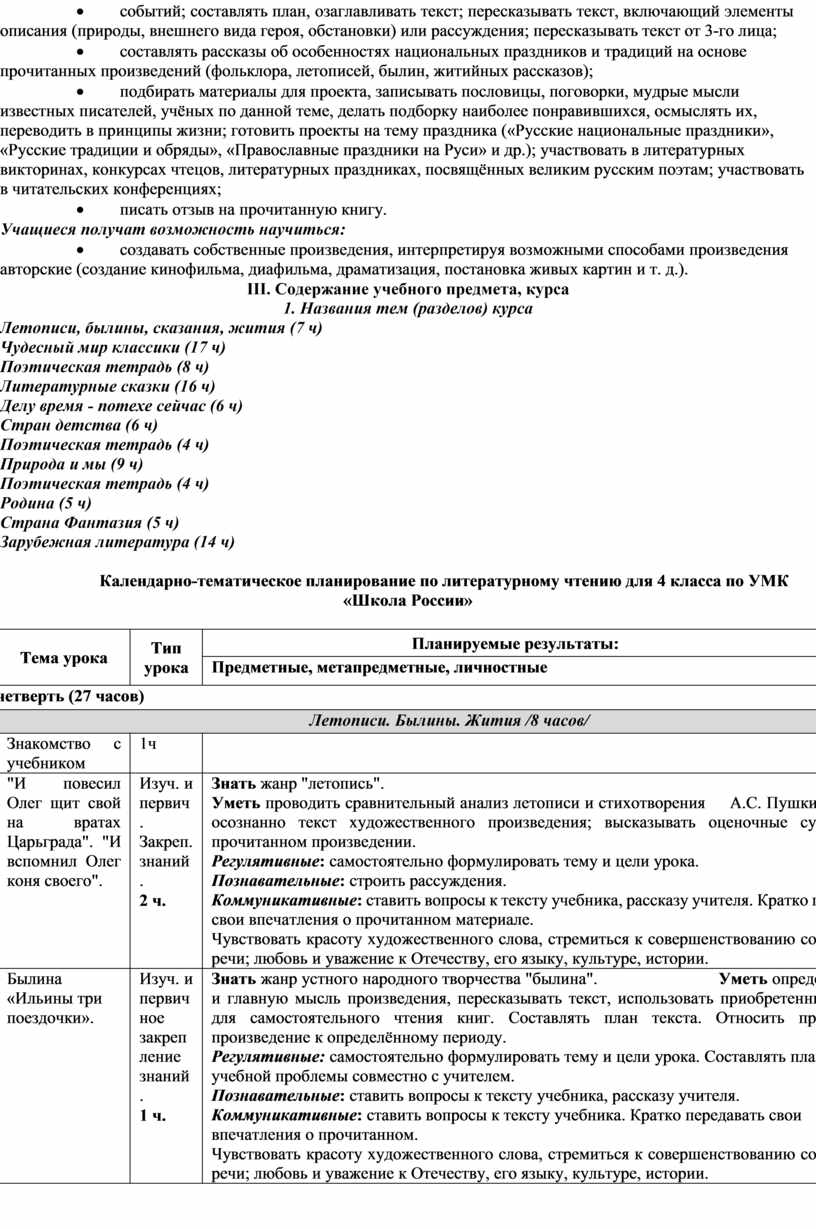 Рабочая программа конкретизирует содержание предметных тем образовательного стандарта и дает примерное распределение учебных часов по разделам курса и последовательность изучения разделов литературного чтения с учетом межпредметных связей, логики представления учебного материала, возрастных особенностей учащихся.