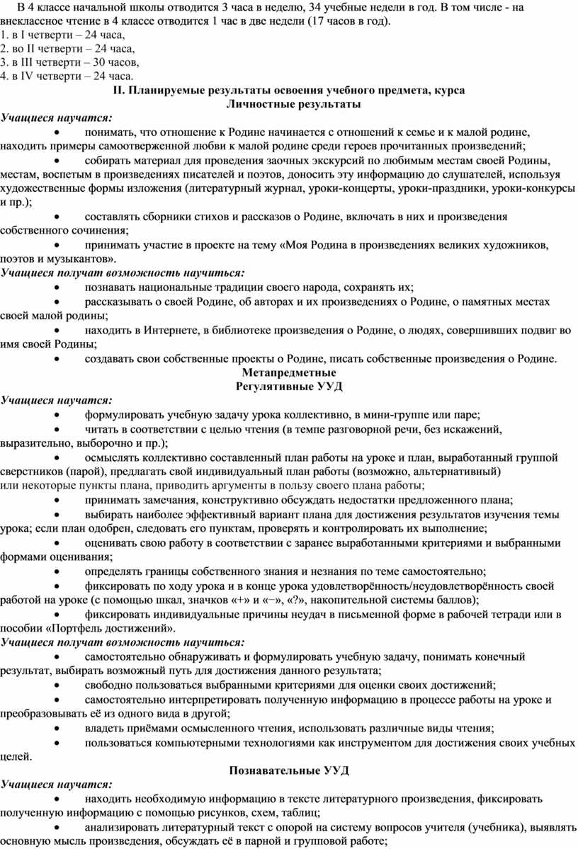 В 4 классе начальной школы отводится 3 часа в неделю, 34 учебные недели в год. В том числе - на внеклассное чтение в 4 классе отводится 1 час в две недели (17 часов в год).