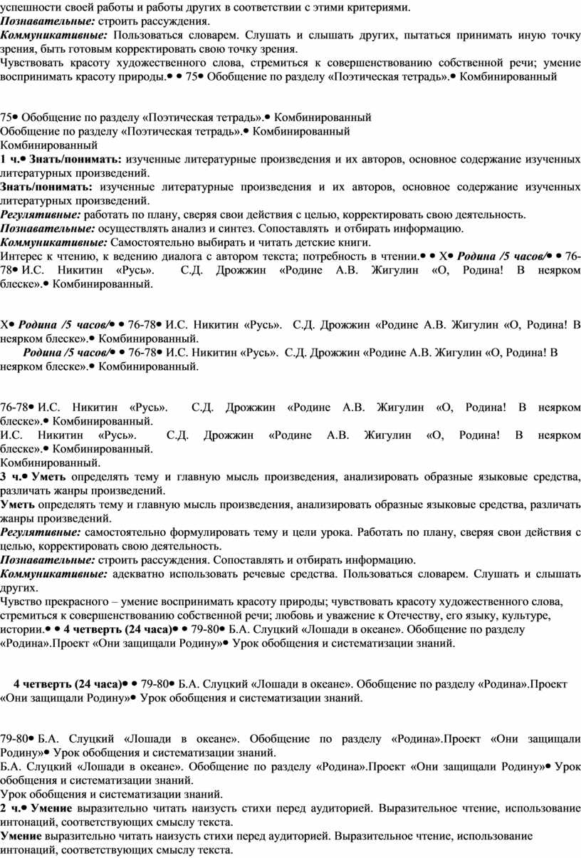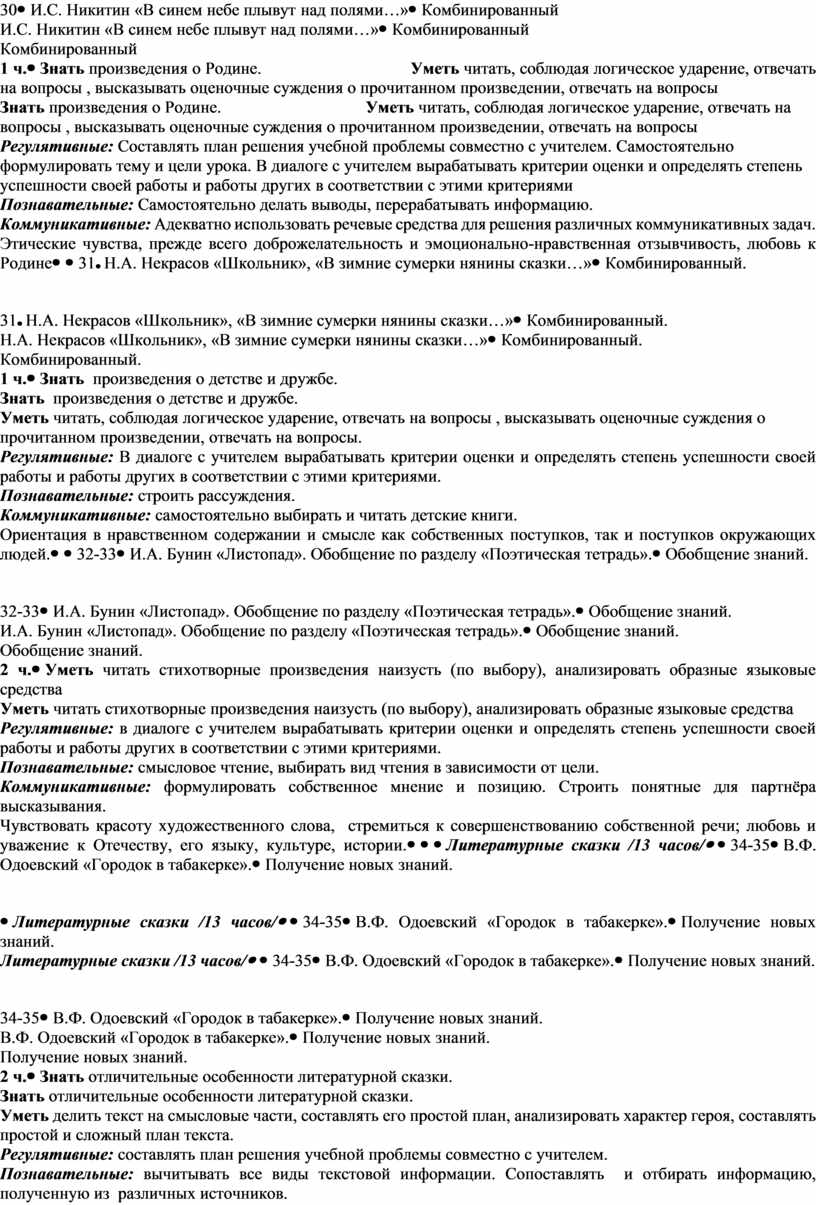 Уметь определять тему и главную мысль произведения, анализировать образные языковые средства, различать жанры произведений. Регулятивные: самостоятельно формулировать тему и цели урока. Работать по плану, сверяя свои действия с целью, корректировать свою деятельность. Познавательные: строить рассуждения. Сопоставлять и отбирать информацию. Коммуникативные: адекватно использовать речевые средства. Пользоваться словарем. Слушать и слышать других. Чувство прекрасного – умение воспринимать красоту природы; чувствовать красоту художественного слова, стремиться к совершенствованию собственной речи; любовь и уважение к Отечеству, его языку, культуре, истории. |