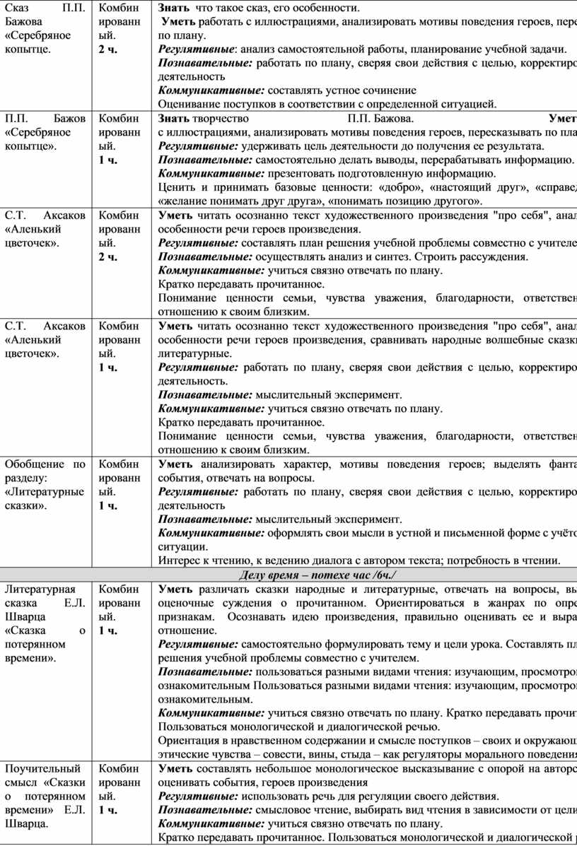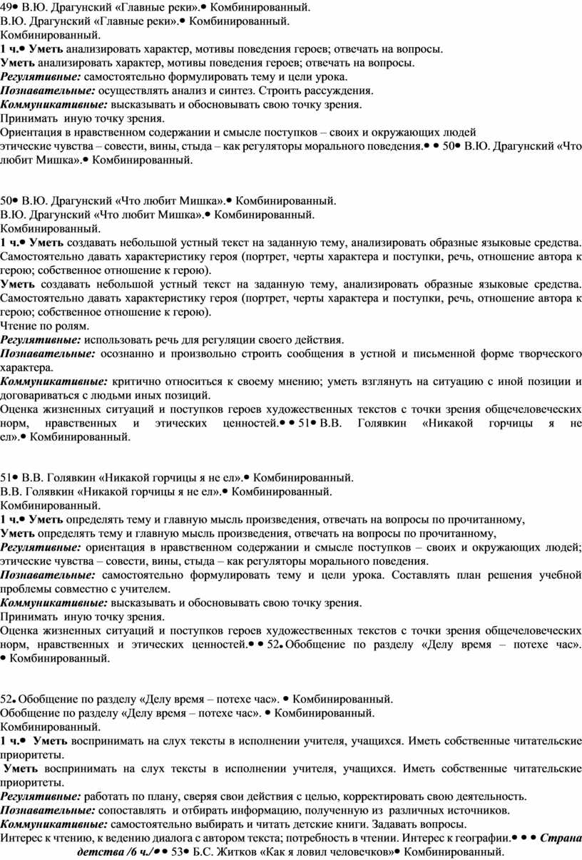 Знать/понимать: изученные литературные произведения и их авторов, основное содержание изученных литературных произведений. Регулятивные: работать по плану, сверяя свои действия с целью, корректировать свою деятельность. Познавательные: осуществлять анализ и синтез. Сопоставлять и отбирать информацию. Коммуникативные: Самостоятельно выбирать и читать детские книги. Интерес к чтению, к ведению диалога с автором текста; потребность в чтении. |