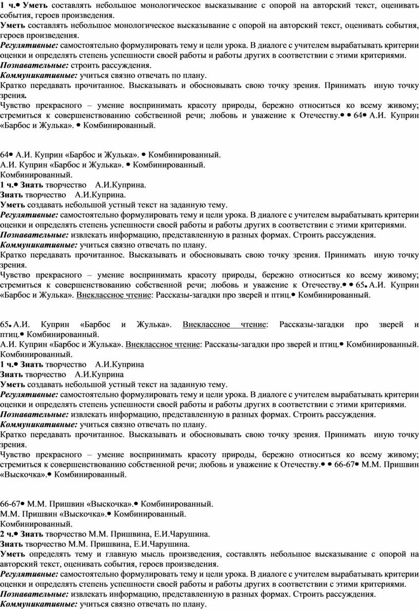 Знать творчество А.И.Куприна. Уметь создавать небольшой устный текст на заданную тему. Регулятивные: самостоятельно формулировать тему и цели урока. В диалоге с учителем вырабатывать критерии оценки и определять степень успешности своей работы и работы других в соответствии с этими критериями. Познавательные: извлекать информацию, представленную в разных формах. Строить рассуждения. Коммуникативные: учиться связно отвечать по плану. Кратко передавать прочитанное. Высказывать и обосновывать свою точку зрения. Принимать иную точку зрения. Чувство прекрасного – умение воспринимать красоту природы, бережно относиться ко всему живому; стремиться к совершенствованию собственной речи; любовь и уважение к Отечеству. |