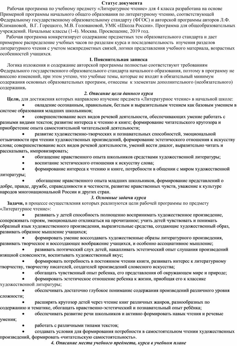 Рабочая программа по учебному предмету «Литературное чтение» для 4 класса разработана на основе Примерной программы начального общего образования по литературному чтению, соответствующей Федеральному государственному образовательному стандарту (ФГОС) и авторской программы авторов Л.Ф. Климановой, В.Г. Горецкого, М.В. Головановой, УМК «Школа России». Программа для общеобразовательных учреждений. Начальные классы (1-4). Москва. Просвещение, 2019 год.