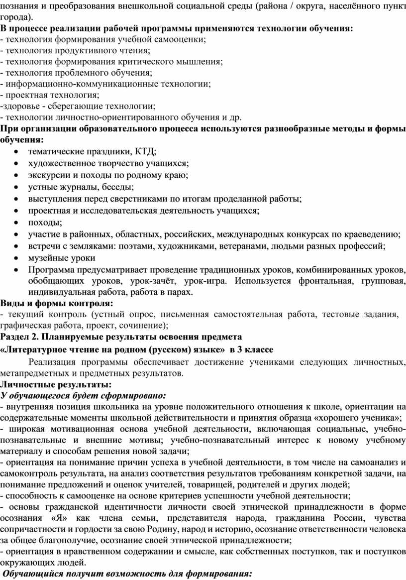 обучающихся, воспринимающих на более высоких ступенях своего развития чтение как особый процесс постижения мира и человека, постижения художественного пространства произведений устного народного творчества и авторской литературы, в то же время как вид деятельности, требующей интеллектуальных усилий, знаний и умений для решения определённых читательских задач, в совокупности дающих компетентного читателя-школьника с чёткими и осознанными личностными установками. Обучение в начальной школе рассматривается как необходимый и важнейший этап на пути достижения этой цели. В соответствии с данными теоретическими установками предмет «Литературное чтение на родном(русском) языке» имеет следующие цели и задачи.