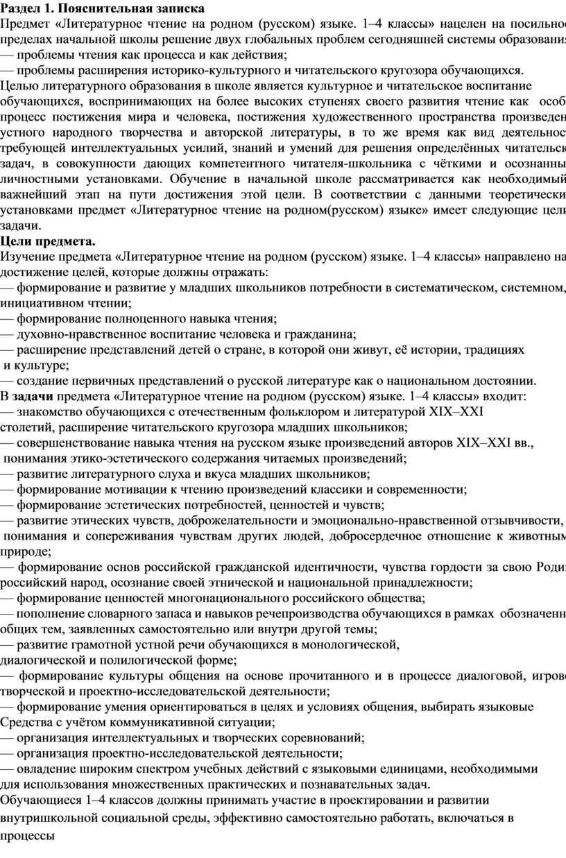 Предмет «Литературное чтение на родном (русском) языке. 1–4 классы» нацелен на посильное в пределах начальной школы решение двух глобальных проблем сегодняшней системы образования: