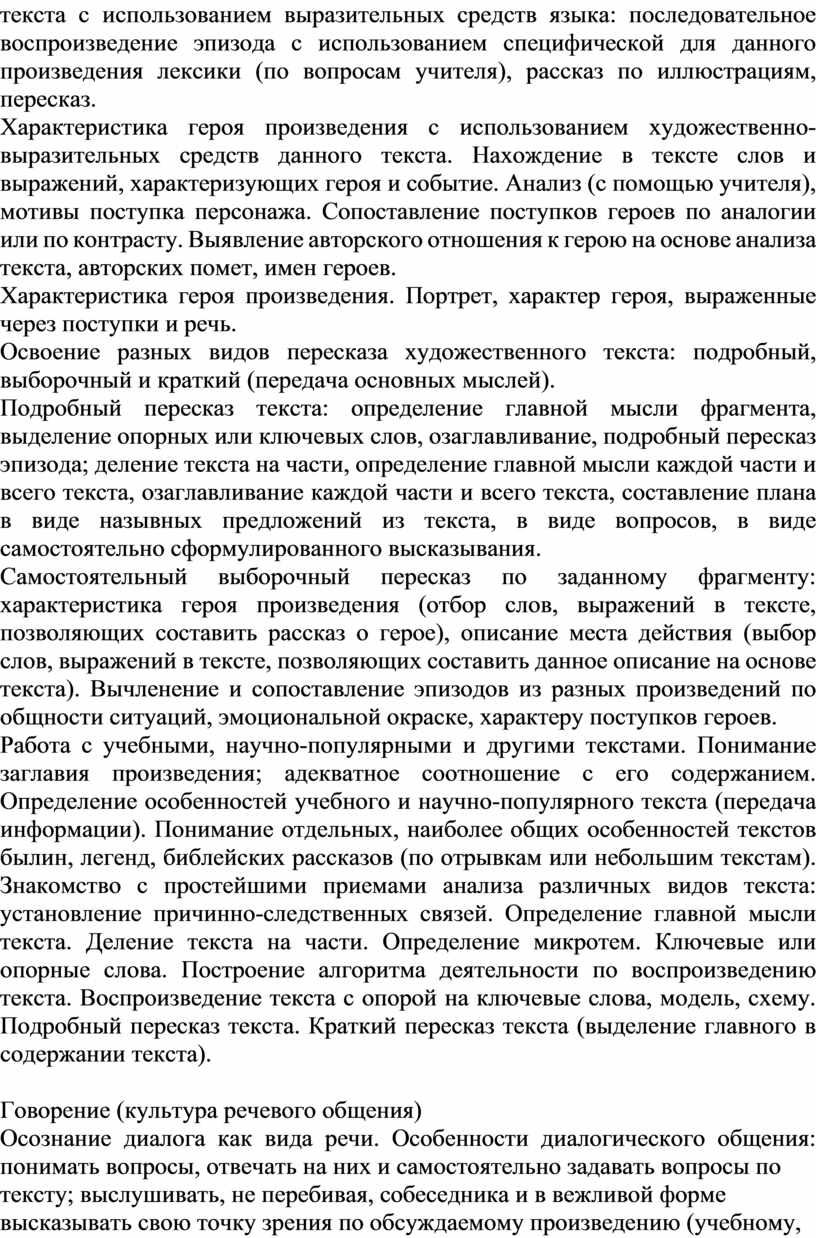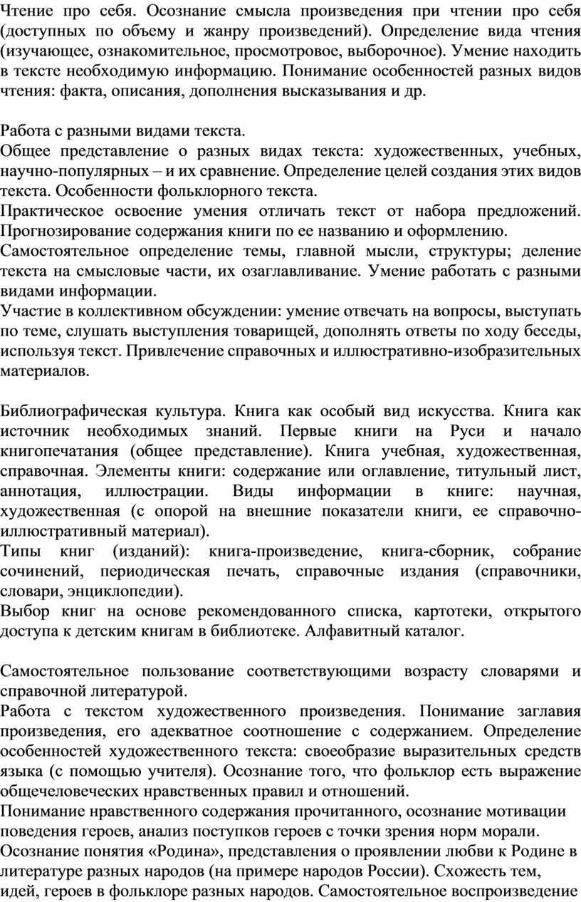 Понимание нравственного содержания прочитанного, осознание мотивации поведения героев, анализ поступков героев с точки зрения норм морали. Осознание понятия «Родина», представления о проявлении любви к Родине в литературе разных народов (на примере народов России). Схожесть тем, идей, героев в фольклоре разных народов. Самостоятельное воспроизведение текста с использованием выразительных средств языка: последовательное воспроизведение эпизода с использованием специфической для данного произведения лексики (по вопросам учителя), рассказ по иллюстрациям, пересказ.