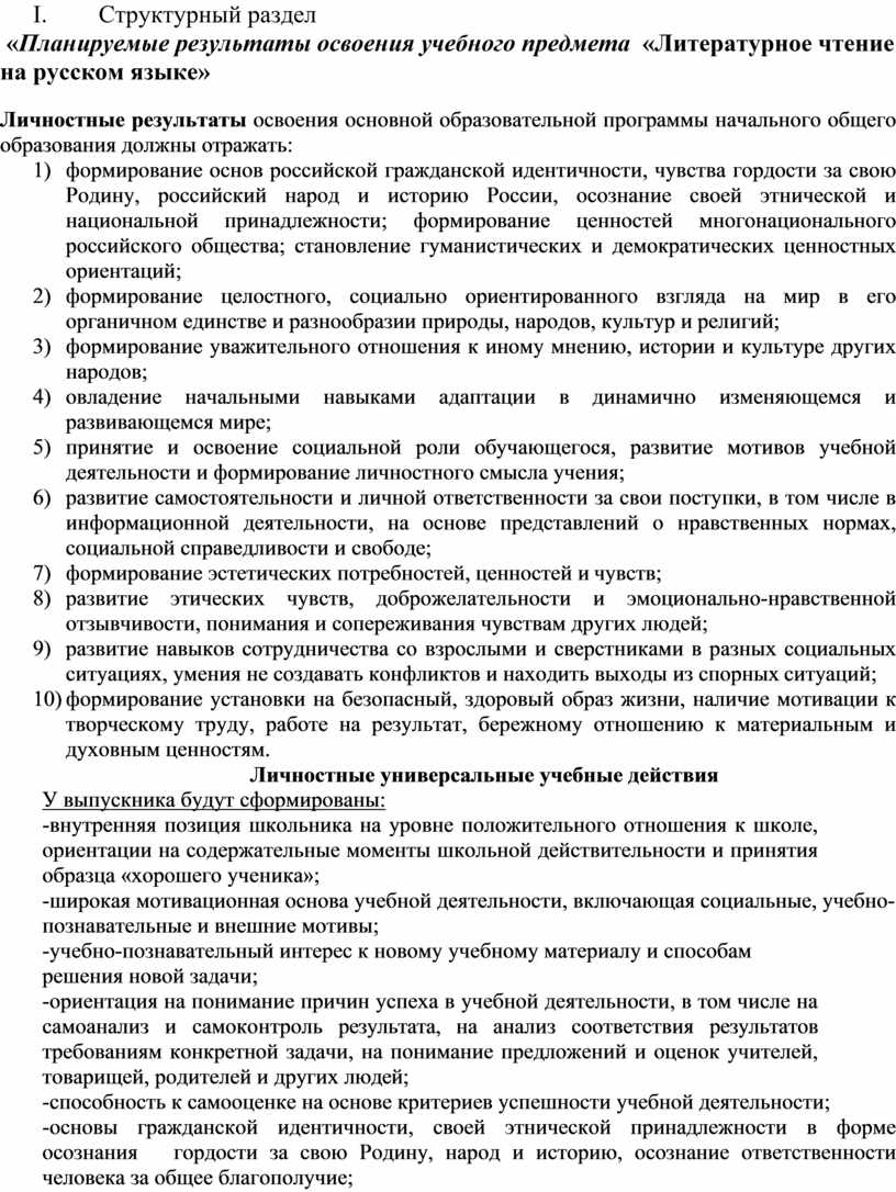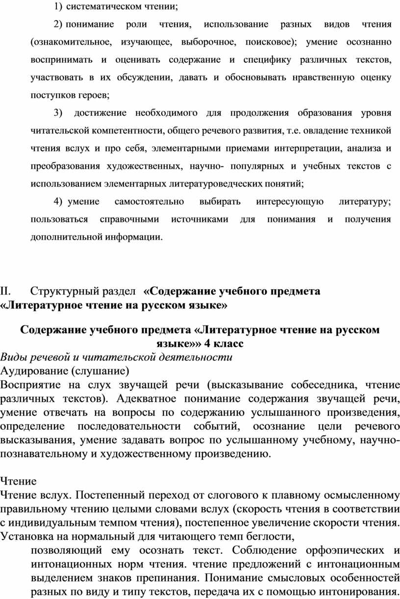 II. Структурный раздел «Содержание учебного предмета «Литературное чтение на русском языке»