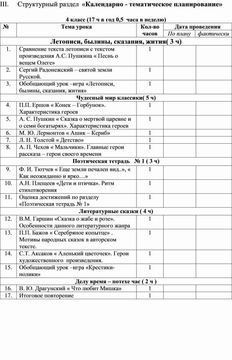 Тематическое планирование 4 класс (17 ч в год 0,5 часа в неделю)