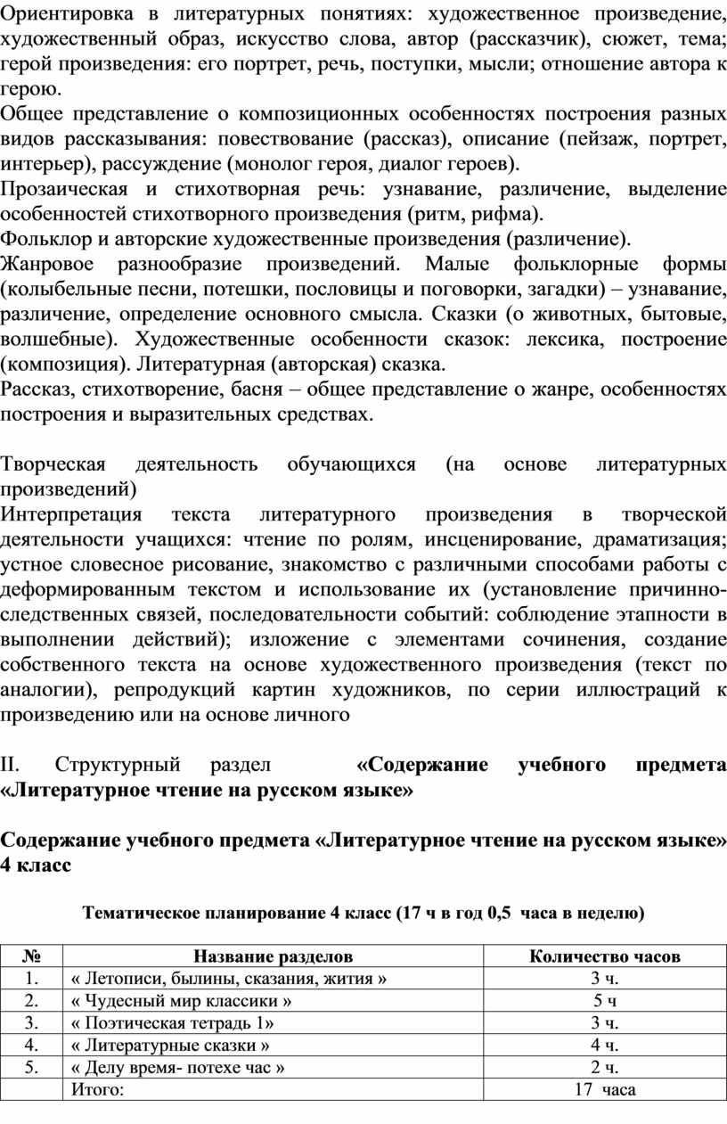 Содержание учебного предмета «Литературное чтение на русском языке»» 4 класс