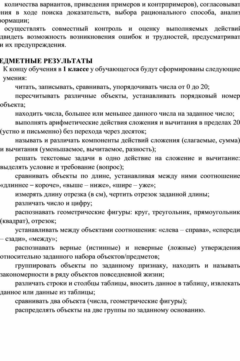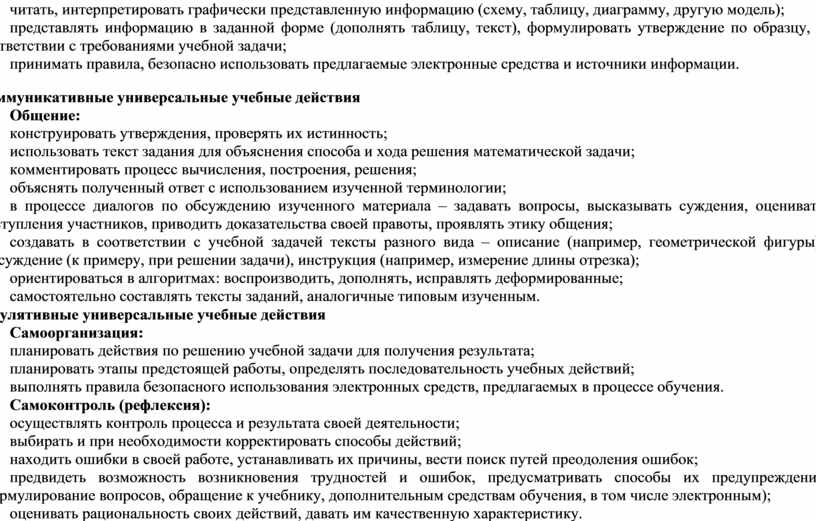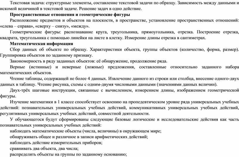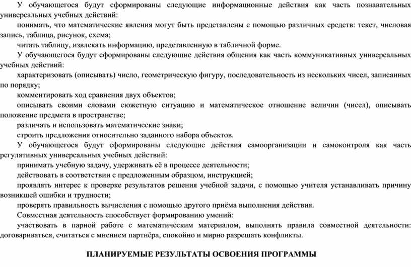 Изучение математики в 1 классе способствует освоению на пропедевтическом уровне ряда универсальных учебных действий: познавательных универсальных учебных действий, коммуникативных универсальных учебных действий, регулятивных универсальных учебных действий, совместной деятельности.