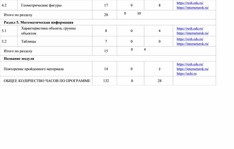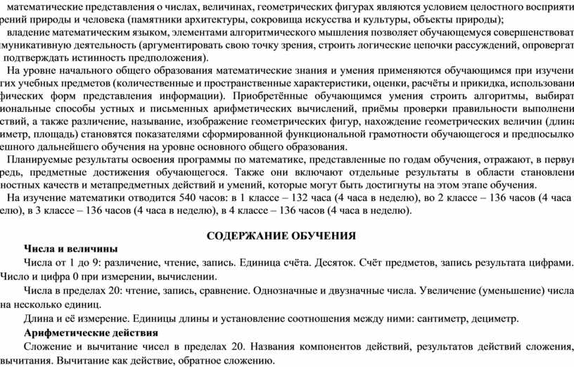 На изучение математики отводится 540 часов: в 1 классе – 132 часа (4 часа в неделю), во 2 классе – 136 часов (4 часа в неделю), в 3 классе – 136 часов (4 часа в неделю), в 4 классе – 136 часов (4 часа в неделю).
