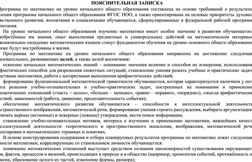 Программа по математике на уровне начального общего образования составлена на основе требований к результатам освоения программы начального общего образования ФГОС НОО, а также ориентирована на целевые приоритеты духовно-нравственного развития, воспитания и социализации обучающихся, сформулированные в федеральной рабочей программе воспитания.