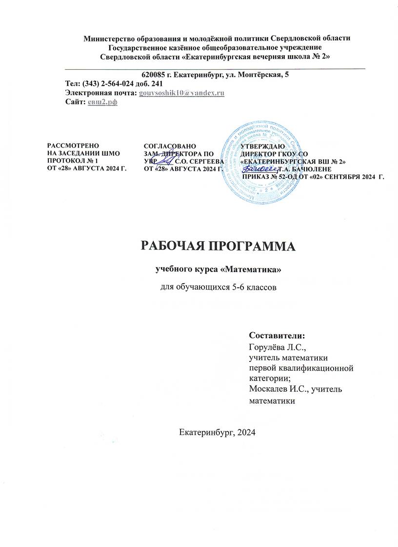 В соответствии с ФГОС ООО учебный предмет «Математика» входит в предметную область «Математика и информатика» и является обязательным для изучения. Учитывая специфику образовательной организации «Екатеринбургская ВШ № 2» как режимного объекта и, соответственно, работы школы в условиях нахождения школы на территории исправительного учреждения (пятидневка с количеством уроков в неделю не более 25) основную образовательную программу вечерней школы, формы получения образования (очно-заочное обучение), возрастные и социальнопсихологические особенности обучающихся, на методическом объединении учителей «Екатеринбургская ВШ № 2» была проведена и согласована корректировка настоящей рабочей программы с целью внесения в неё соответствующих изменений.