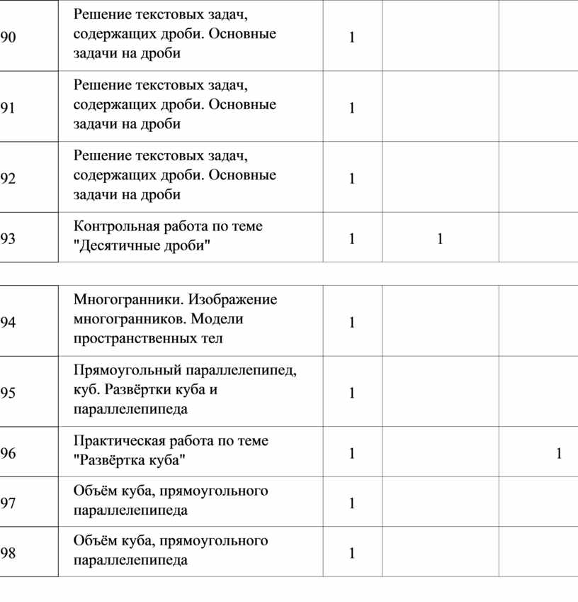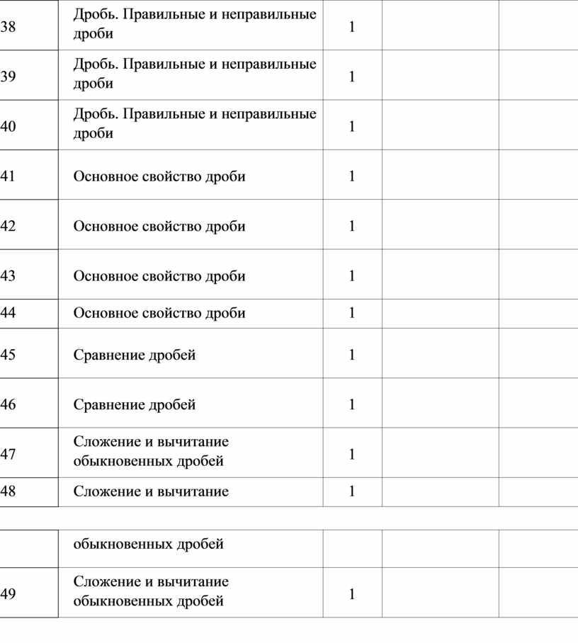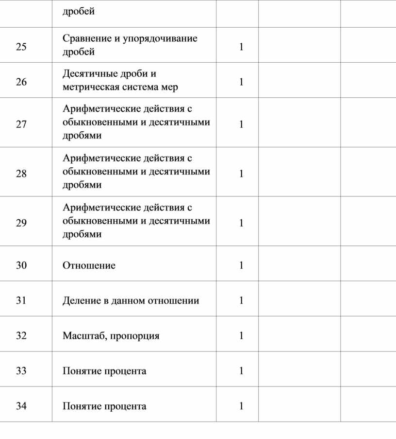 Начало изучения обыкновенных и десятичных дробей отнесено к 5 классу. Это первый этап в освоении дробей, когда происходит знакомство с основными идеями, понятиями темы. При этом рассмотрение обыкновенных дробей в полном объёме предшествует изучению десятичных дробей, что целесообразно с точки зрения логики изложения числовой линии, когда правила действий с десятичными дробями можно обосновать уже известными алгоритмами выполнения действий с обыкновенными дробями. Знакомство с десятичными дробями расширит возможности для понимания обучающимися прикладного применения новой записи при изучении других предметов и при практическом использовании. К 6 классу отнесён второй этап в изучении дробей, где происходит совершенствование навыков сравнения и преобразования дробей, освоение новых вычислительных алгоритмов, оттачивание техники вычислений, в том числе значений выражений, содержащих и обыкновенные, и десятичные дроби, установление связей между ними, рассмотрение приёмов решения задач на дроби. В начале 6 класса происходит знакомство с понятием процента.
