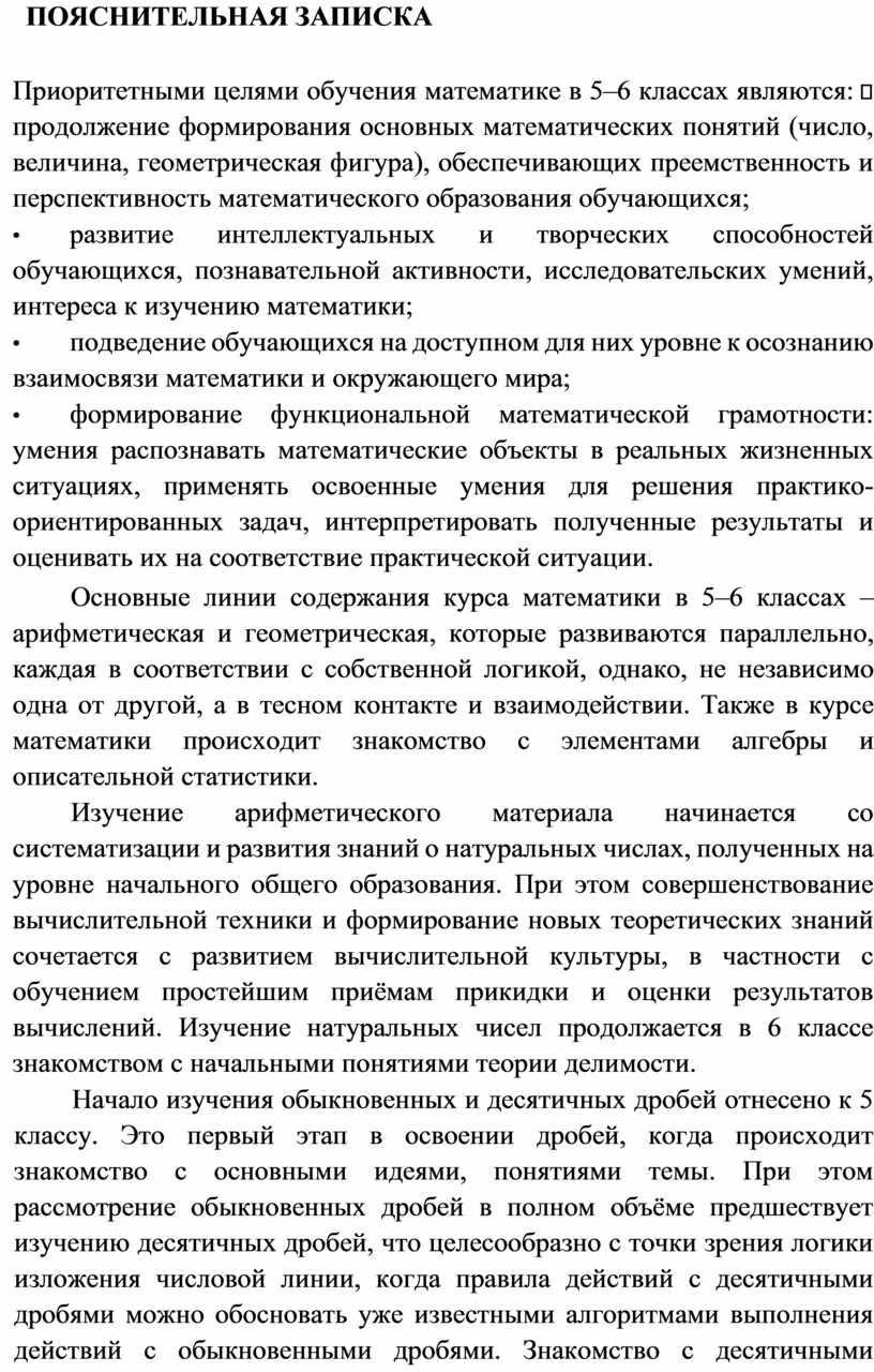 Приоритетными целями обучения математике в 5–6 классах являются: продолжение формирования основных математических понятий (число, величина, геометрическая фигура), обеспечивающих преемственность и перспективность математического образования обучающихся;