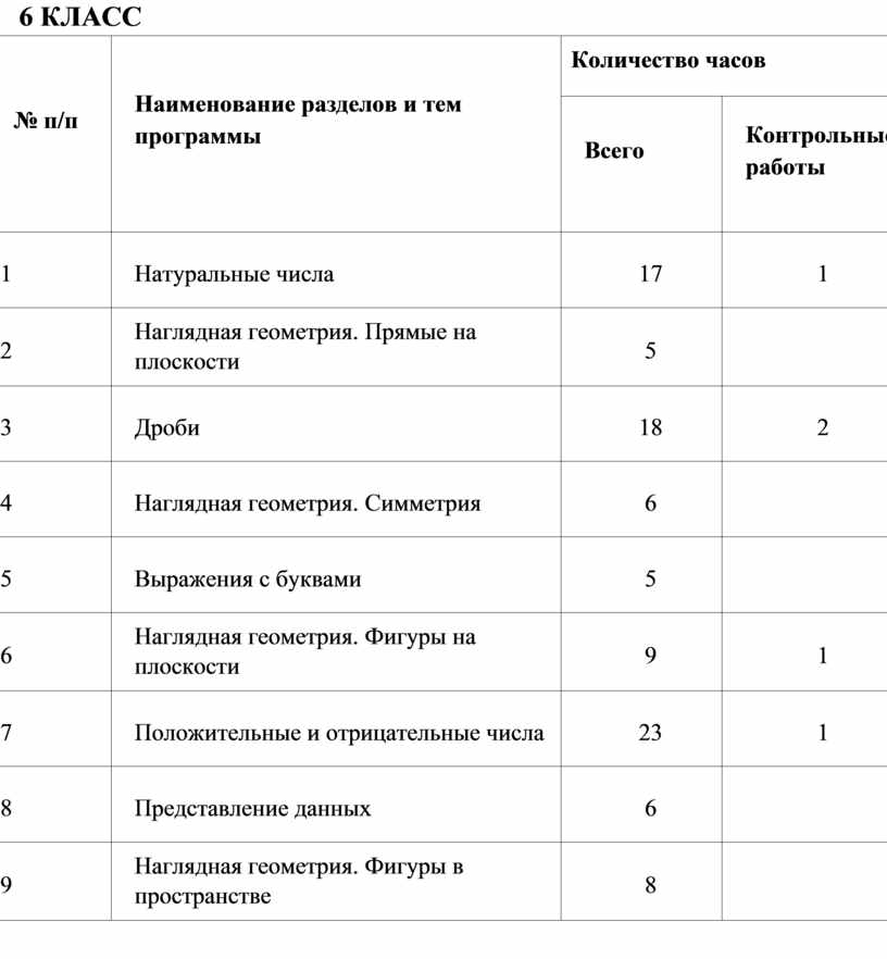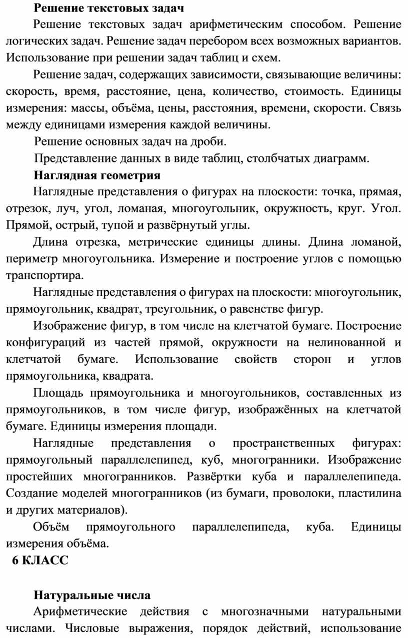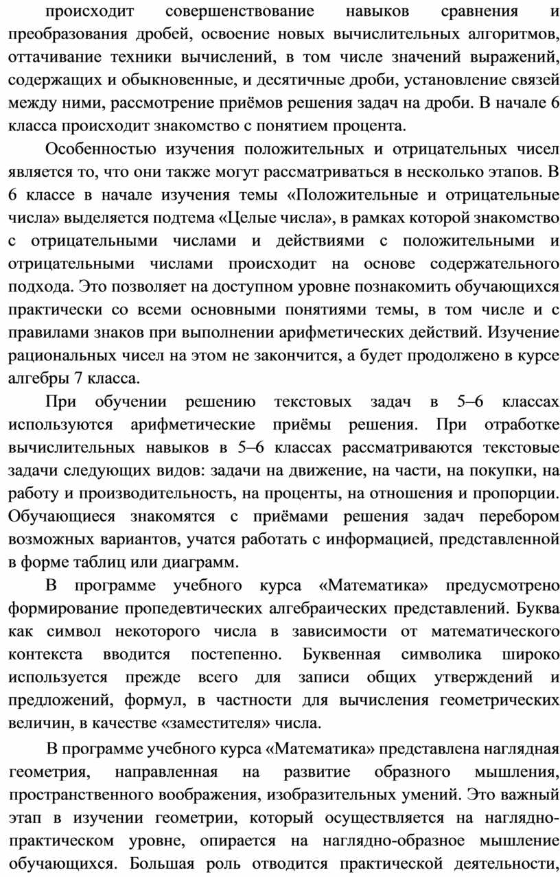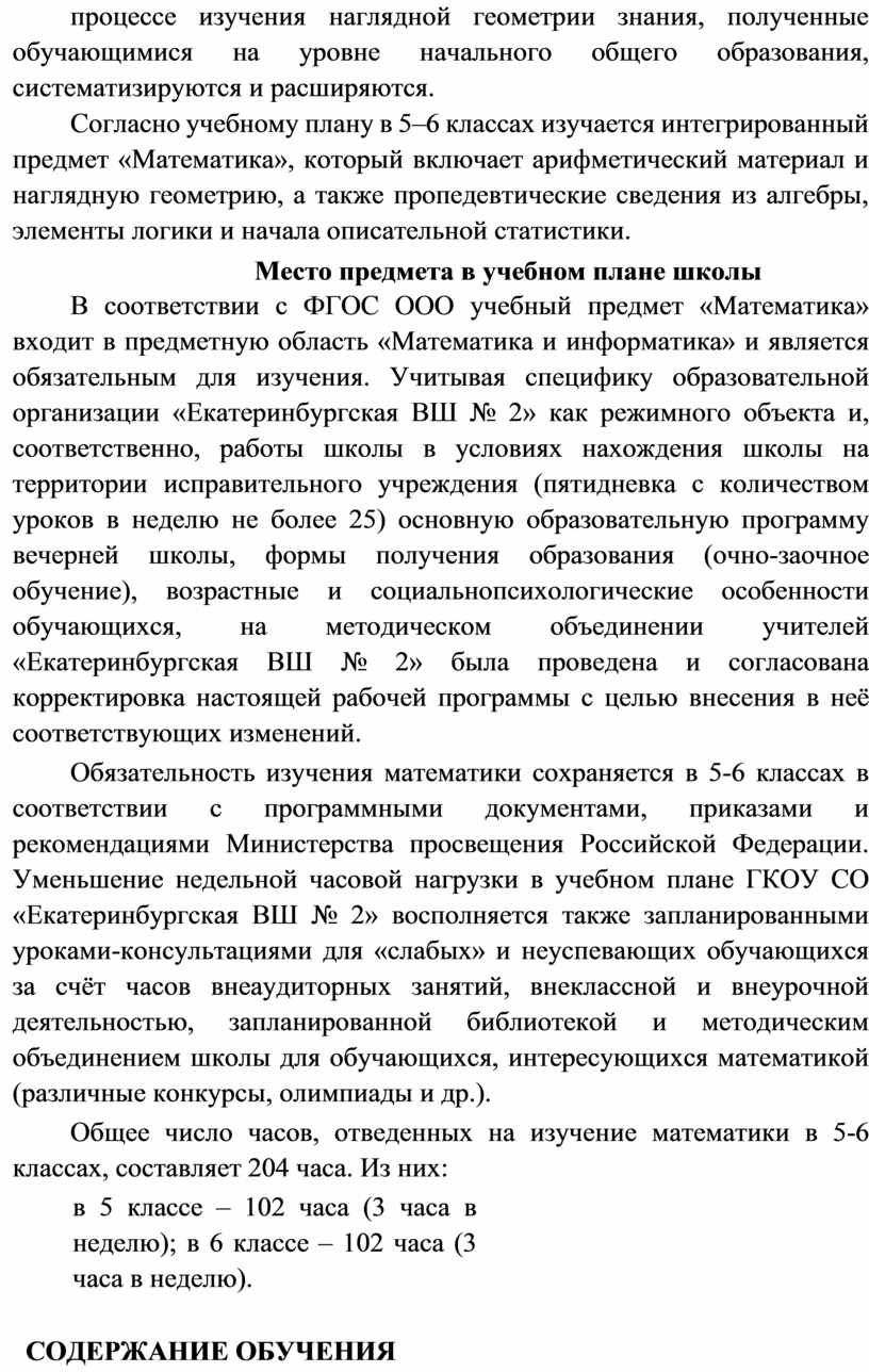 Согласно учебному плану в 5–6 классах изучается интегрированный предмет «Математика», который включает арифметический материал и наглядную геометрию, а также пропедевтические сведения из алгебры, элементы логики и начала описательной статистики.